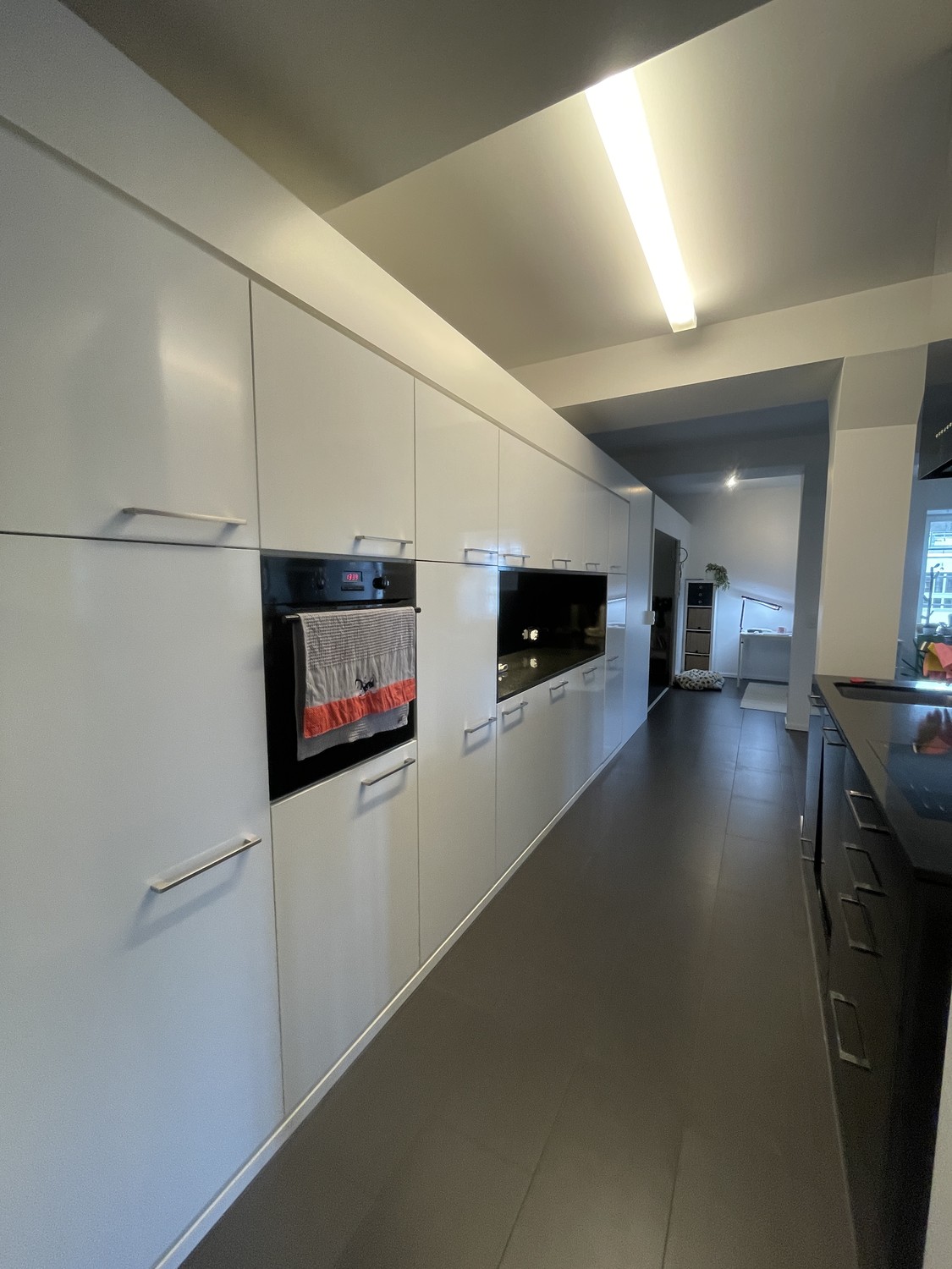 Die stilvolle Küche verfügt über eine praktische Kochinsel, moderne Küchengeräte und viel Stauraum.