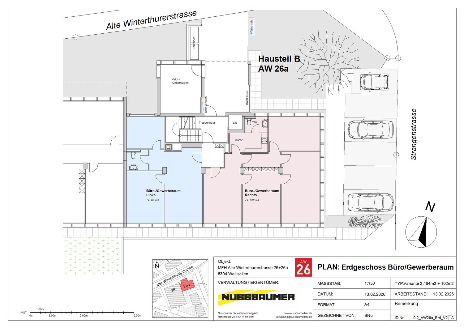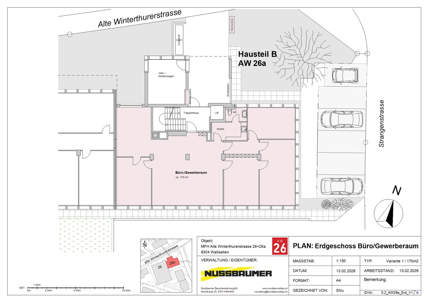 Diese Büro- und Gewerberäume befinden mitten in Wallisellen, direkt an der alten Winterthurerstrasse im Haus Nr. 26a, eine der Hauptverkehrsachsen des Kantons Zürich, und ist somit sehr gut erreichbar. Die Fläche misst 170m2, kann aber bei Bedarf auch angepasst/reduziert werden (Variante 2).