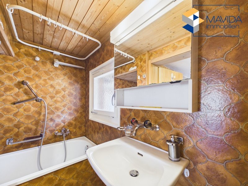 Im mittleren Stock befindet sich das Badezimmer mit Badewanne, Lavabo und WC. Ergänzend steht im Erdgeschoss ein praktisches Aussen-WC zur Verfügung.