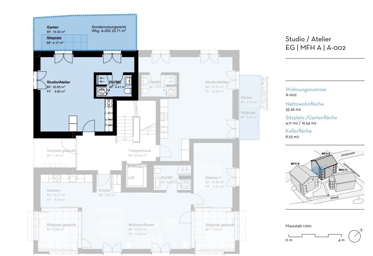 In der Siedlung ist zudem ein weiteres Atelier/Studio im Erdgeschoss A-003 verfügbar - ideal für kreative Köpfe, Homeoffice oder als Rückzugsort mit besonderem Flair.