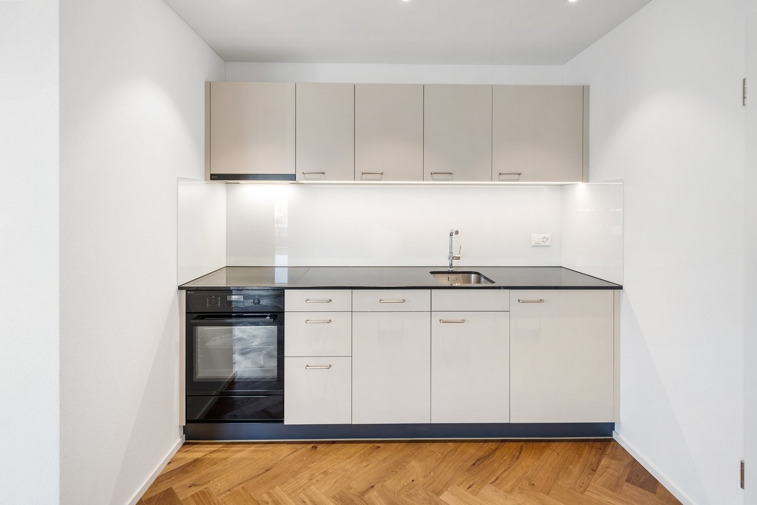 - geölter Eichenparkett (Fischgrät) im Studiobereich, Feinsteinzeugplatten im Küchenbereich