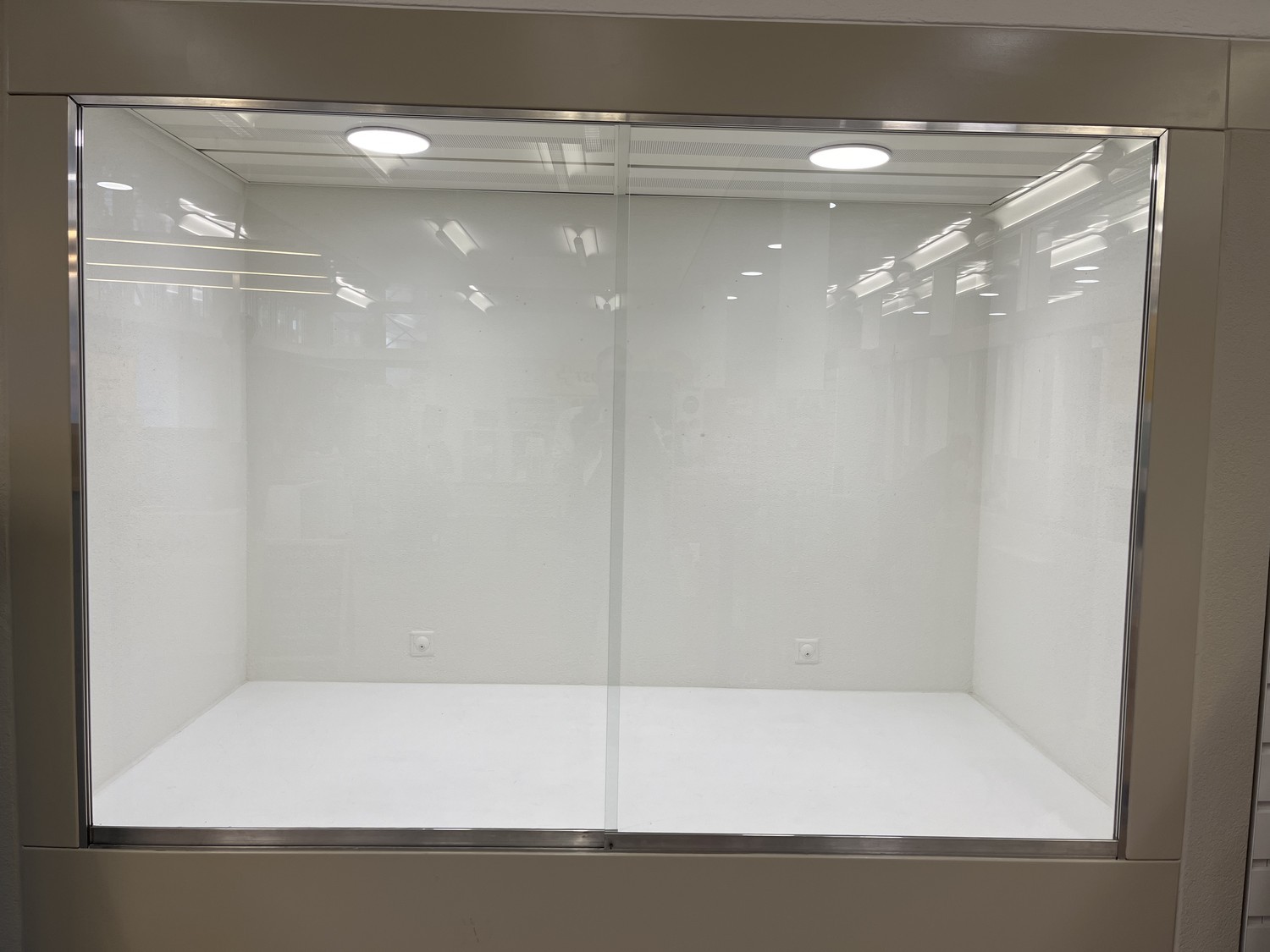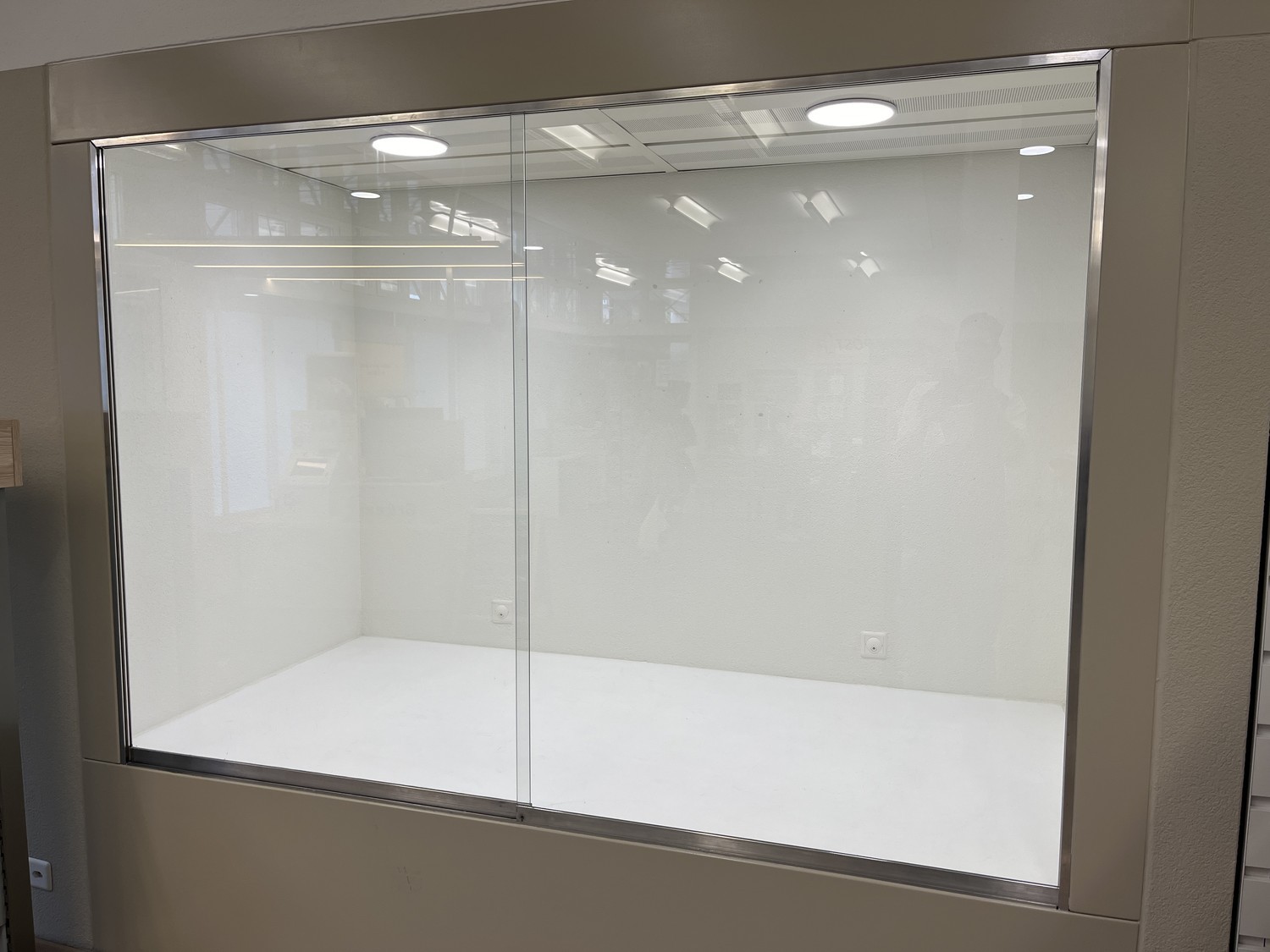 Die Vitrine bietet eine breite Glasfront sowie eine helle, neutrale Präsentationsfläche und ist ideal geeignet für Produktpräsentationen, Werbehinweise oder Informationsauslagen.