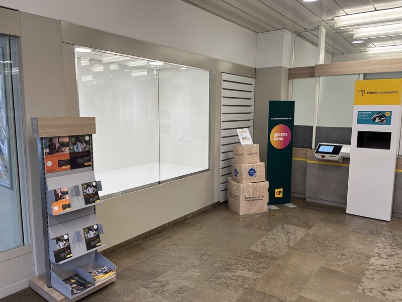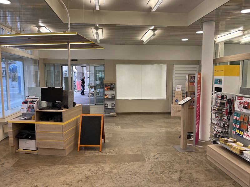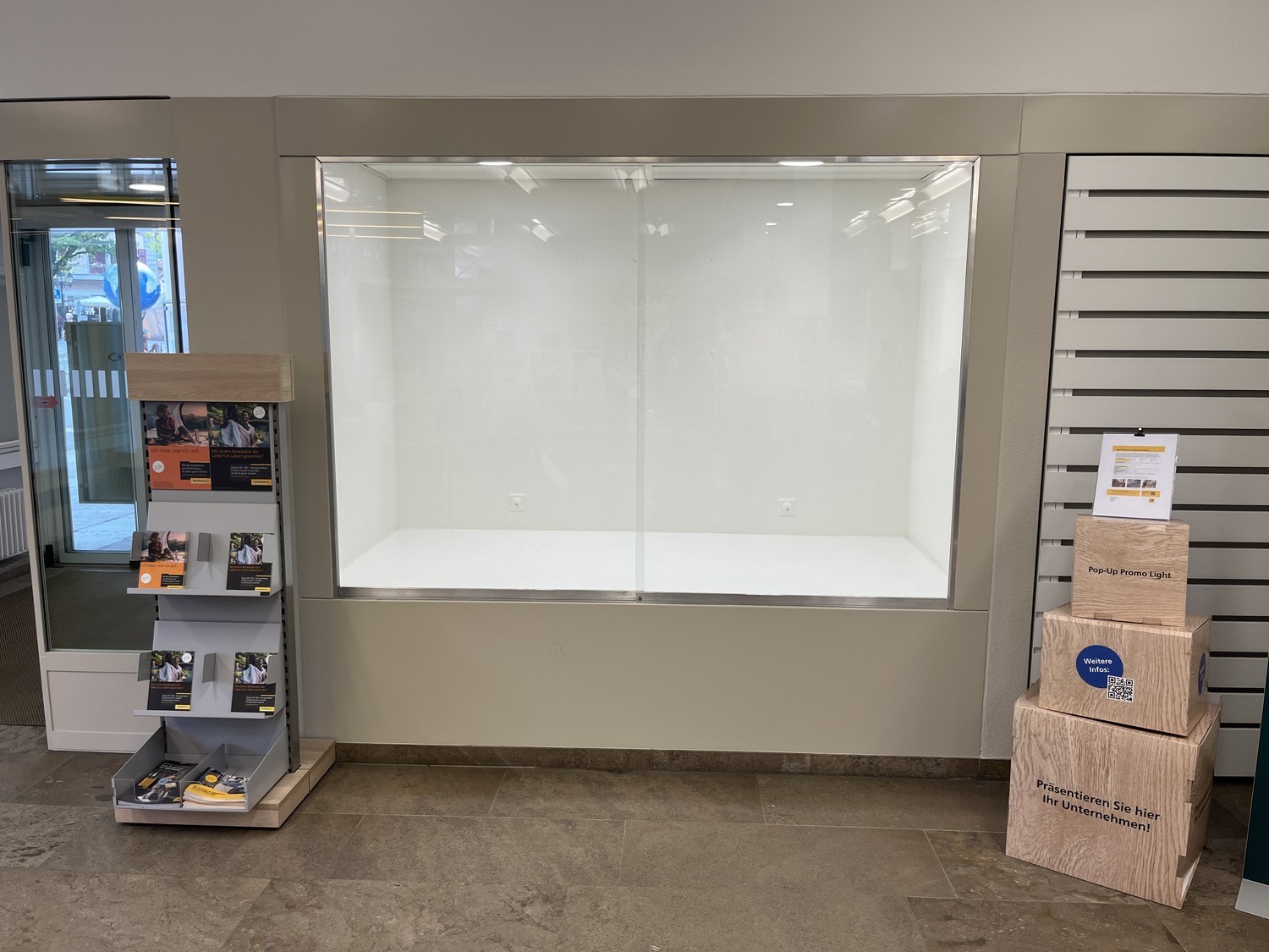 Per 01.04.2026 vermieten wir unsere grosszügige und modern gestaltete Innenvitrine, die sich gut sichtbar im Eingangsbereich der Postfiliale befindet.