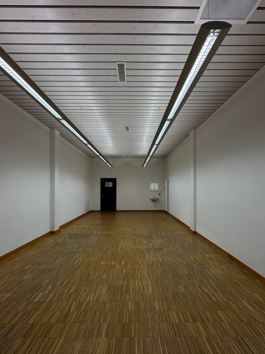 Die Fläche verfügt über hohe Räume, ist beheizt und mit einem Wasseranschluss ausgestattet. Dank ebenerdigem Zugang mit Rampe ist sie auch für Materialanlieferungen oder Lagernutzung bestens geeignet.