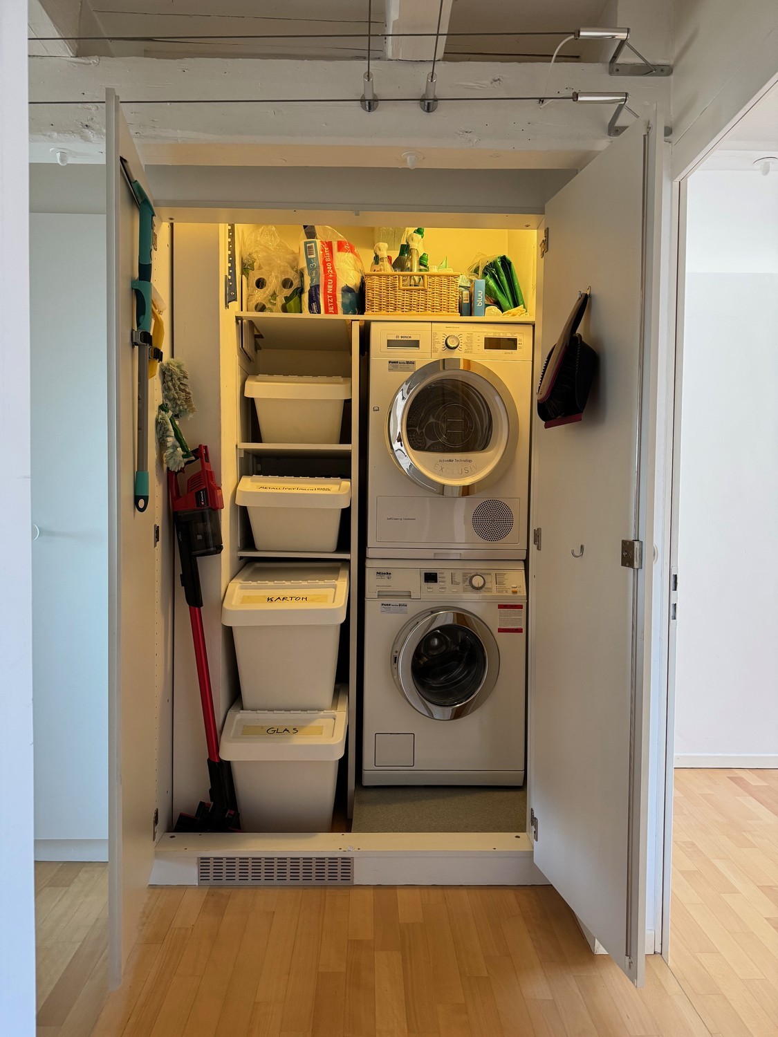 Haushaltsschrank mit Waschmaschine, Tumbler und Recycling-Station