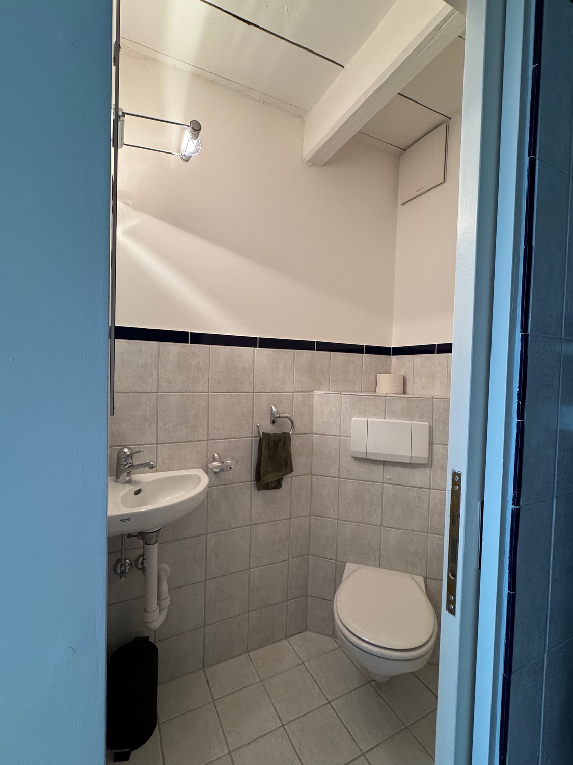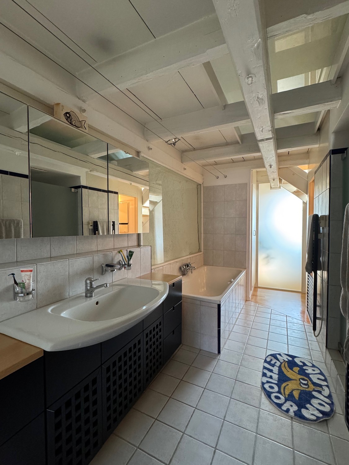 Bad mit grossem Spiegelschrank, Badewanne (auch Trocknungsort für Wäsche), Dusche mit Sichtschutz und WC im Bad separat abschliessbar