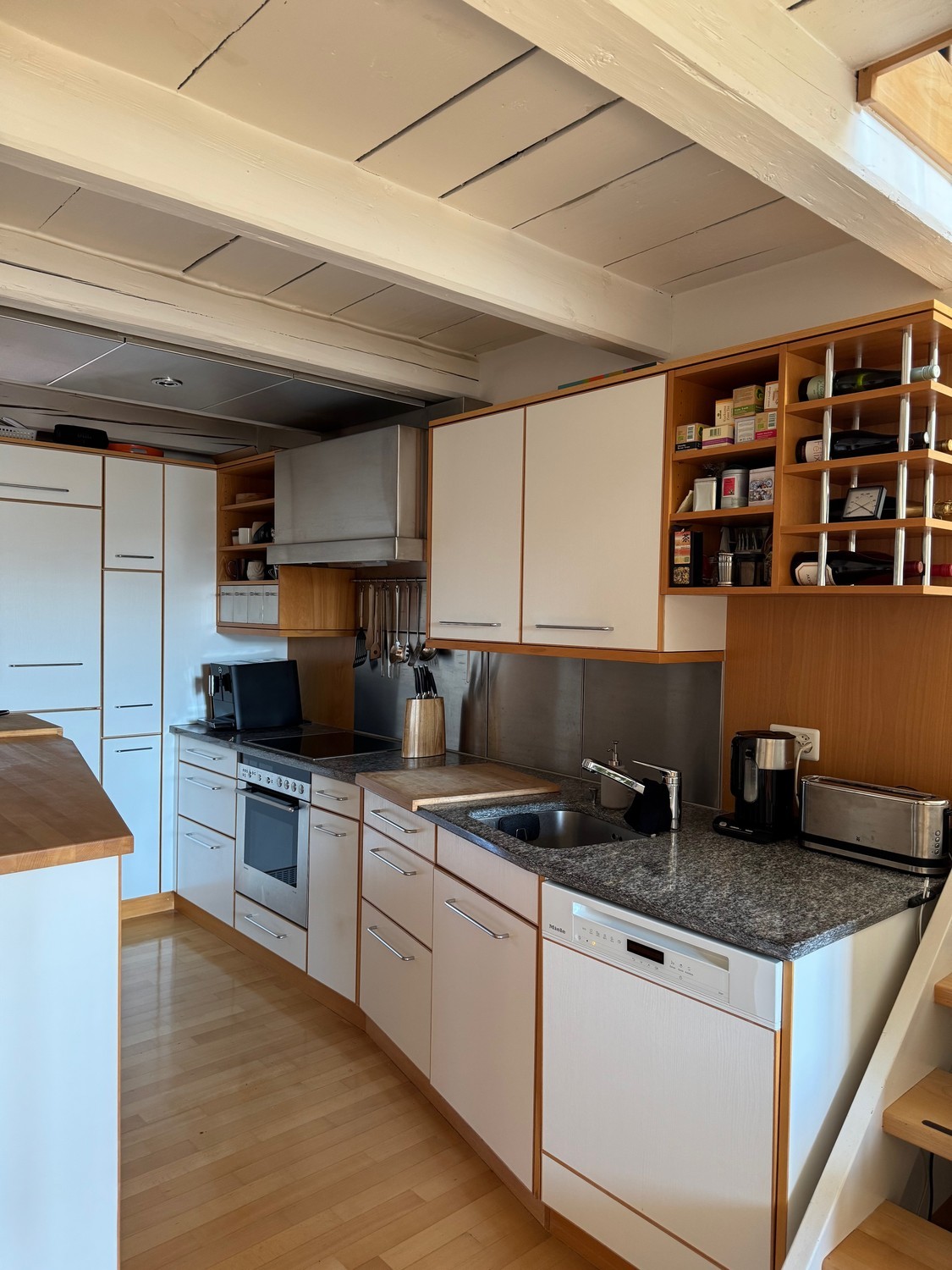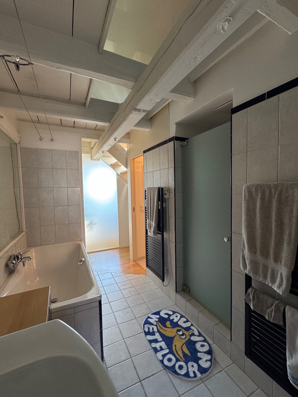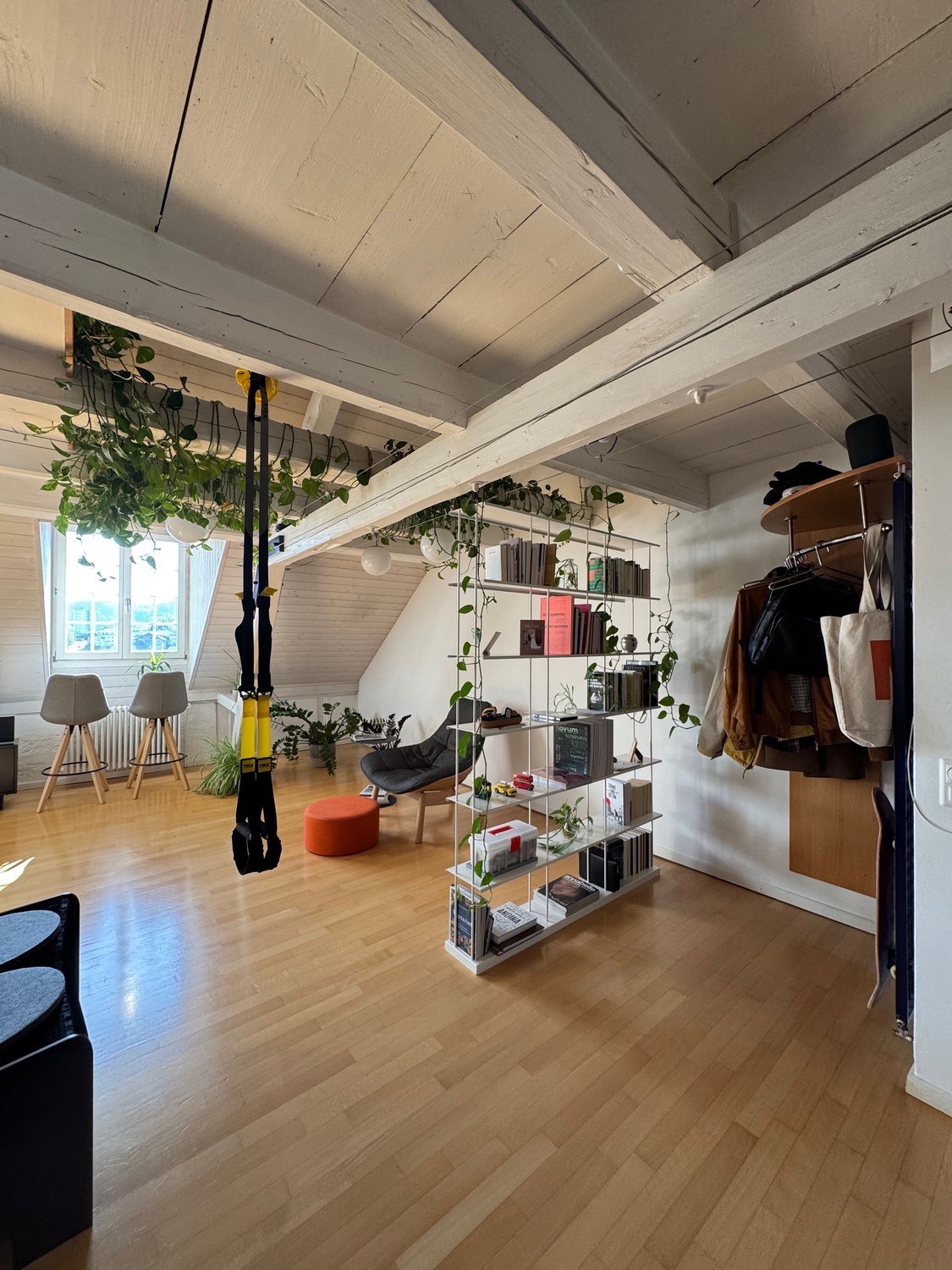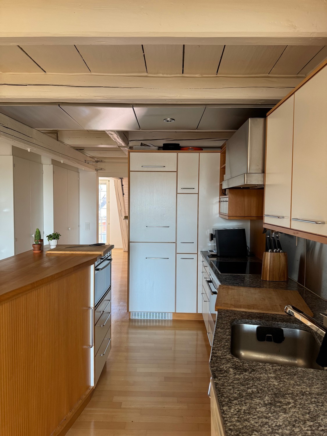 Ein freies Zimmer (ca. 15m2) und ich suchen eine Mitbewohnerin oder einen Mitbewohner. Die 4,5 Zi-Wohnung liegt in der Altstadt von Bremgarten an ruhiger Lage im Dachgeschoss eines historischen Gebäudes. Sie ist mit dem Lift oder einer abenteuerlichen Treppe erreichbar und sogar im Sommer total angenehm vom Klima her. Das Wohnkonzept ist recht offen gestaltet. Die zwei abschliessbaren Zimmer sind aber ganz bewusst als Schlaf- und Rückzugszimmer gedacht. Der Rest der Wohnung ist voll möbliert. Alles darf gerne sorgsam mitbenutzt werden. Sharing is caring. Für Wünsche und Ideen bin ich aber offen.