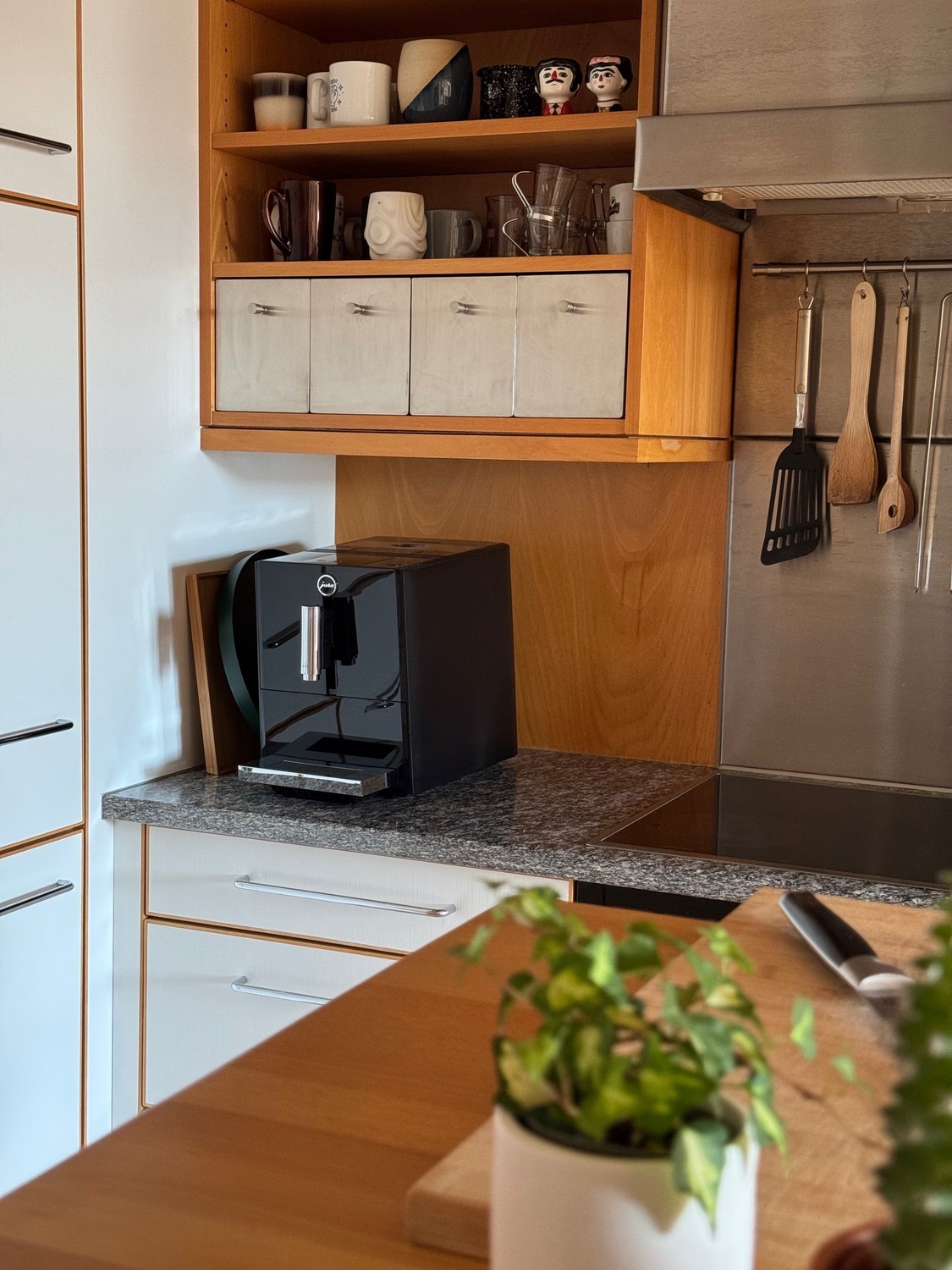 Küche mit Geschirrspüler, Steamer/Backofen, Backofen, grossem Kühlschrank mit kleinem Gefrierfach und Kaffeemaschinen-Vollautomat