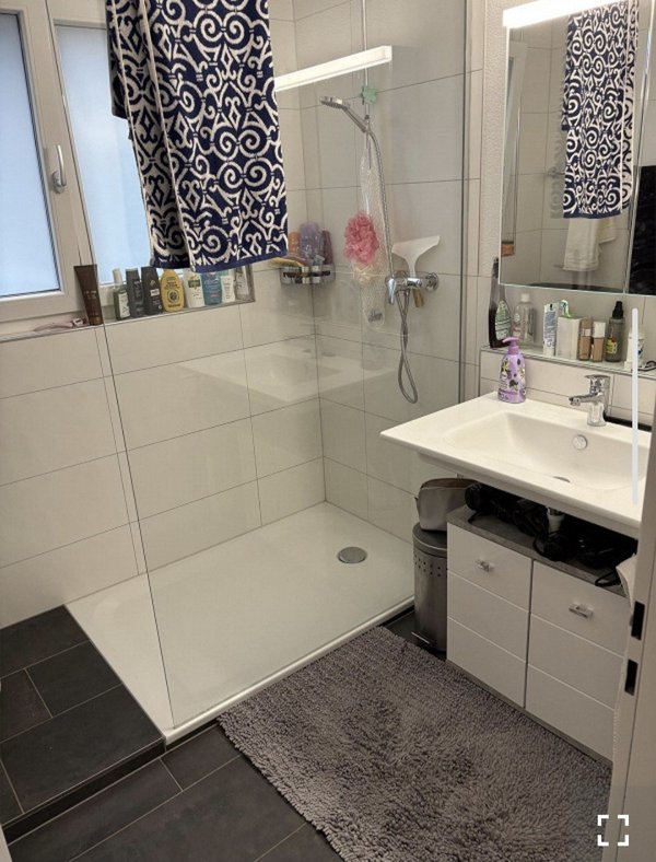 Zeitgemässes Badezimmer: Modern ausgestattet mit Dusche, Waschbecken, Spiegel und Fenster