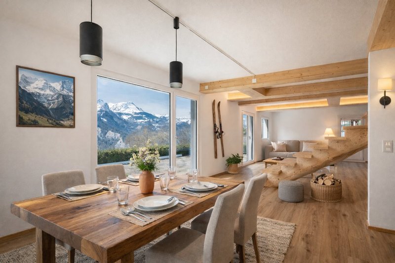 Der grosszügige Wohn- und Essbereich ist lichtdurchflutet und öffnet sich direkt auf die weitläufige Terrasse, der ideale Ort, um die beeindruckende Aussicht auf die Berge zu geniessen.