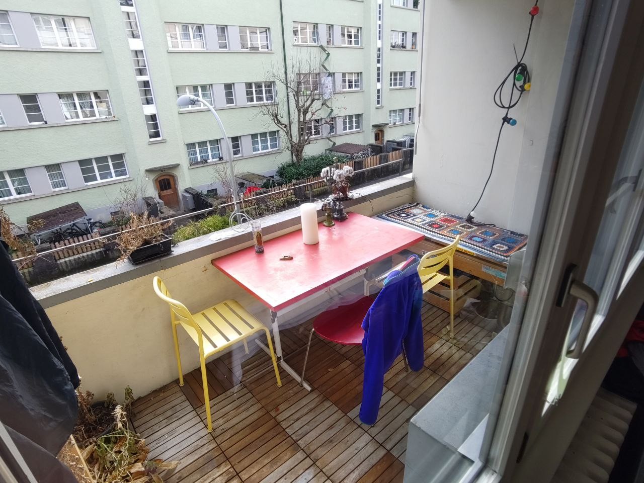 18m2 (~5x3.5m), unmöbliert, sehr hell, verfügt über grösseren Balkon und schönen Parkettboden. Die Wohnung ist im ersten Stock, klein und eine 4er-WG. Hat eine kleine Küche und ein Badezimmer mit Badewanne. Der Balkon steht zur Verfügung der ganzen WG. Wegen Abwesenheit von Wohnzimmer wird auch dieses Zimmer während des Tages oft als solch gebraucht.