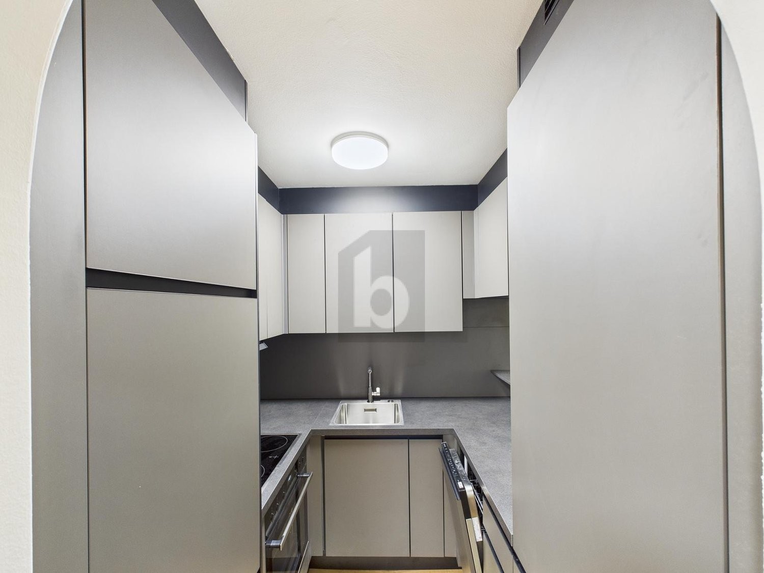 - dunkle, moderne Küche mit den neusten Geräten
