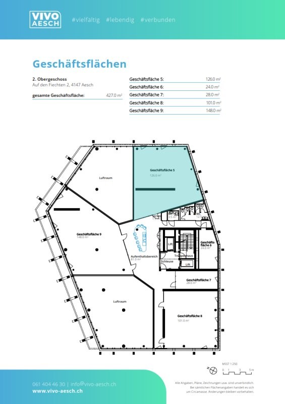 Im Vivo Turm finden Sie im 2. Obergeschoss die "Geschäftsfläche 5" mit 126 m2 , welche per sofort bezugsbereit ist.