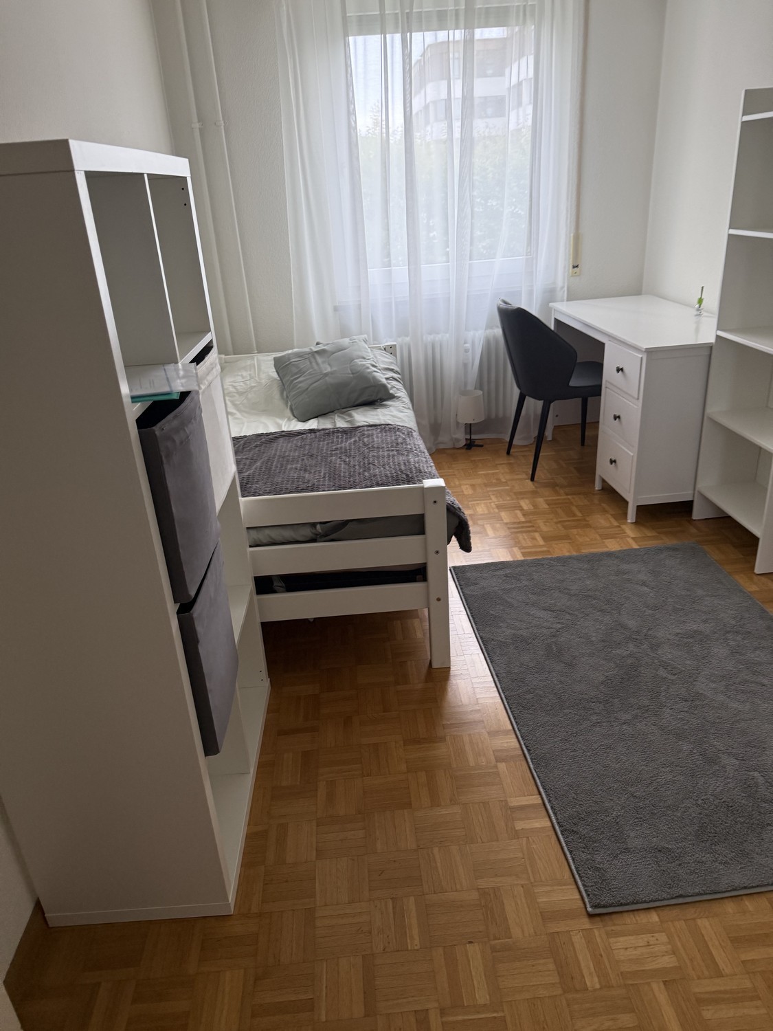 Es verfügt über ein bequemes Bett, einen praktischen Kleiderschrank sowie einen Schreibtisch und Stuhl – ideal zum Lernen oder Arbeiten.