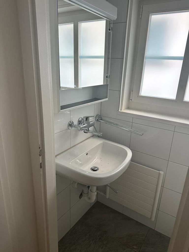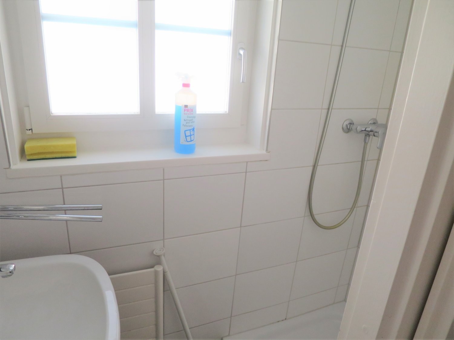 Kleine Dusche: Kleines, aber funktionales Bad mit weissem Waschbecken, weissen Fliesen, Spiegel und Fenster für natürliches Licht