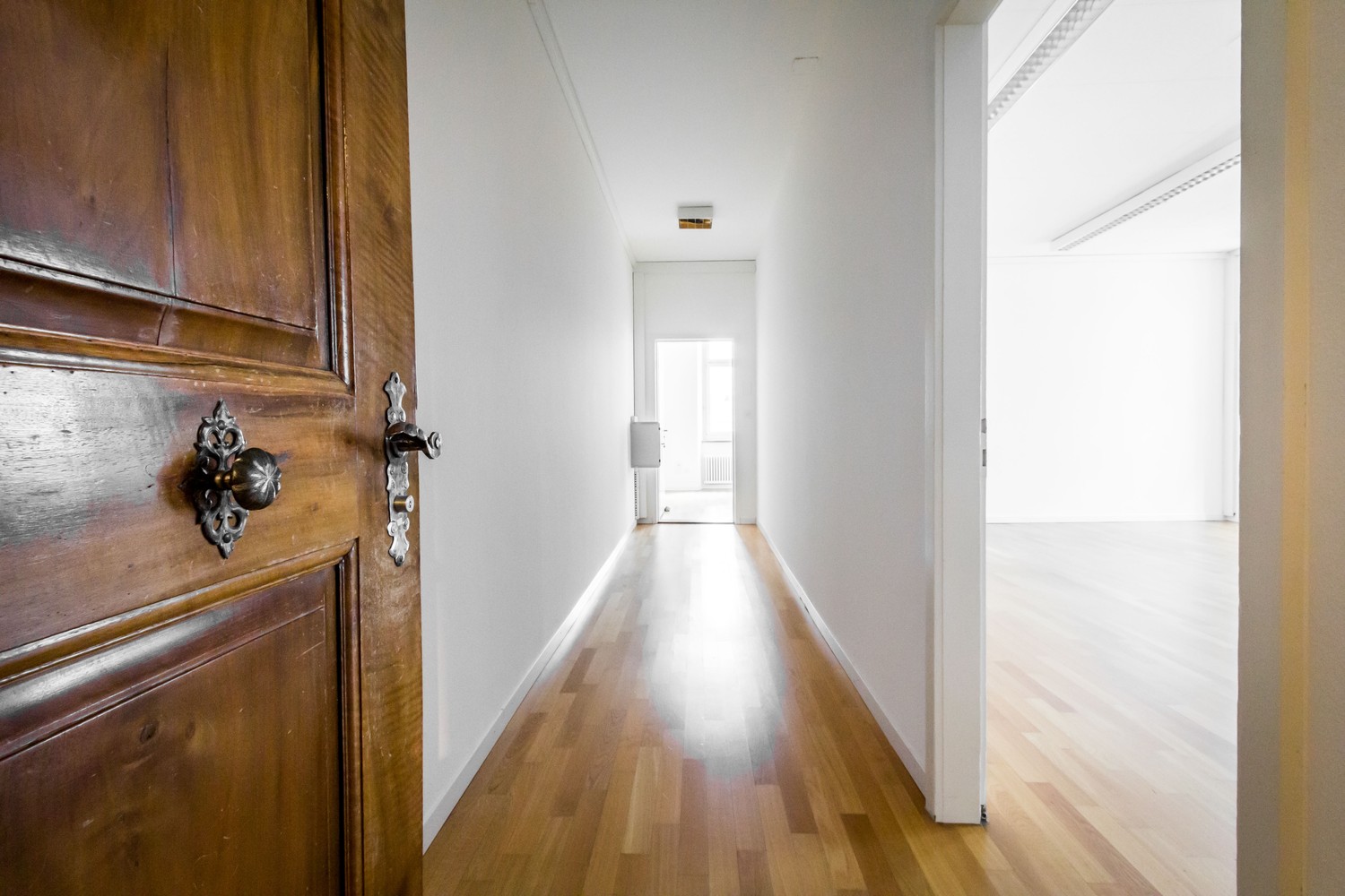 Die Fläche besticht durch viel natürliches Licht und eine warme Atmosphäre, die insbesondere durch hochwertige Parkettböden und dekorative Holzverkleidungen an der Decke geschaffen wird. Die Raumhöhen variieren von 2.5 bis 3.0 Meter.