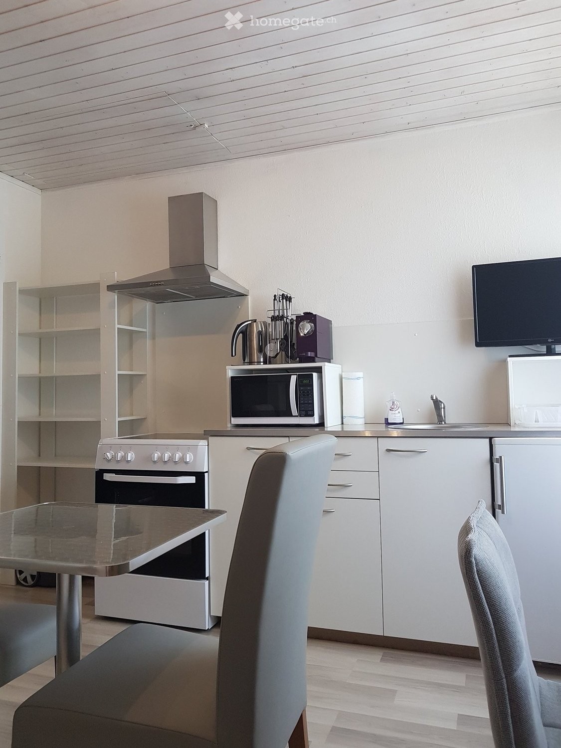 Superficie: Environ 15 m². Lit 90 X 200 cm. Table de nuit, Table bureau + chaise de bureau, Fauteuil relax, Armoire 4 portes, Bibliothèque. Cuisinette, Table de cuisine + deux chaises, Frigo, Cuisinière vitrocéram 4 feux, Four, Microondes, machine à café, bouilloire électrique + matériel de cuisine et vaisselle. Linge de lit et de maison. TV, WIFI, aspirateur.