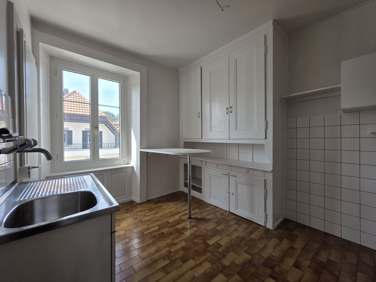 Cuisine non agencée (seulement hotte de ventilation, hall, salle de douche, WC séparés, séjour et 2 chambres avec parquet , chauffage central.