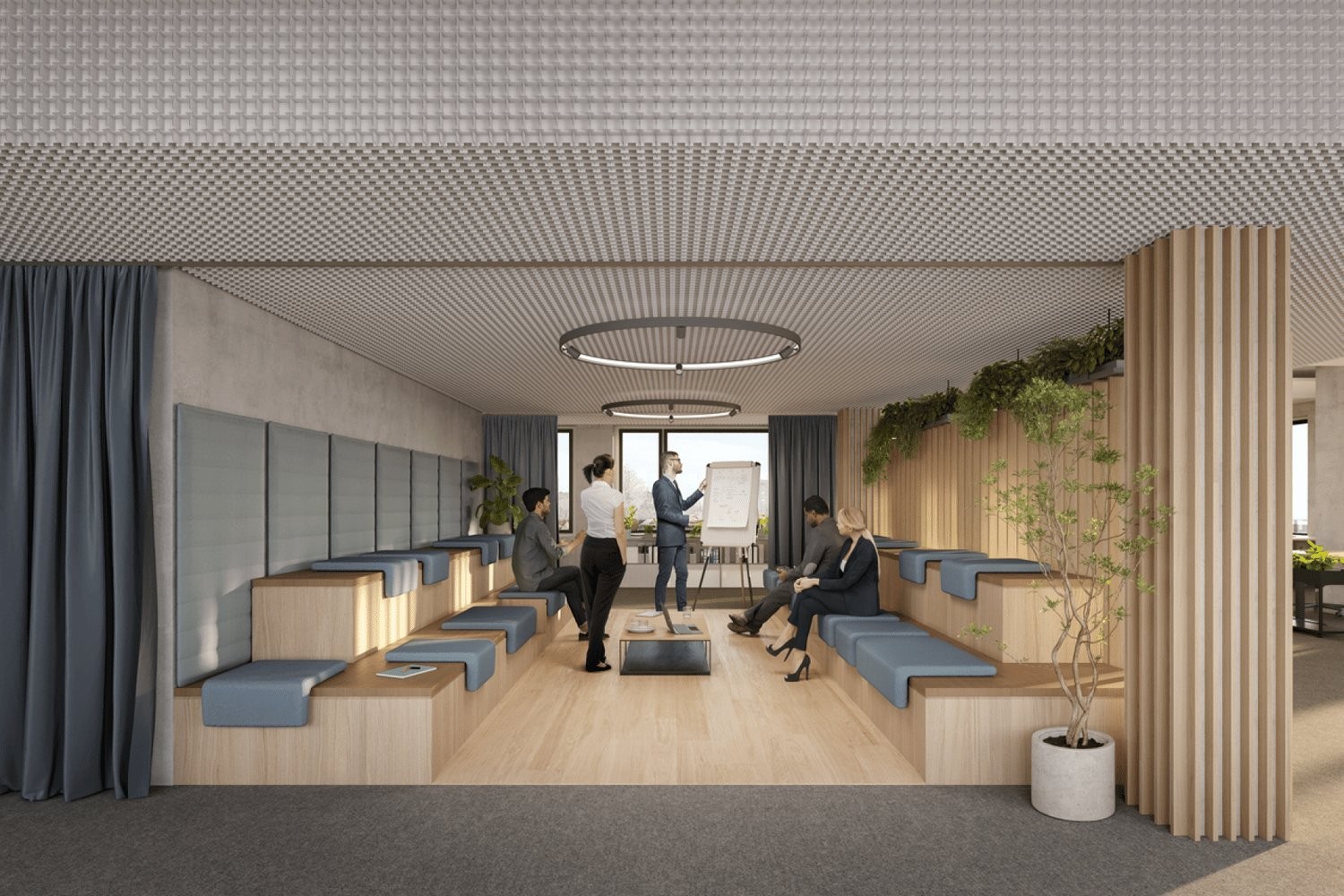 Architecture moderne, chauffage/rafraîchissement par plafonds actifs, ventilation double flux, plancher technique et sanitaires avec PMR.