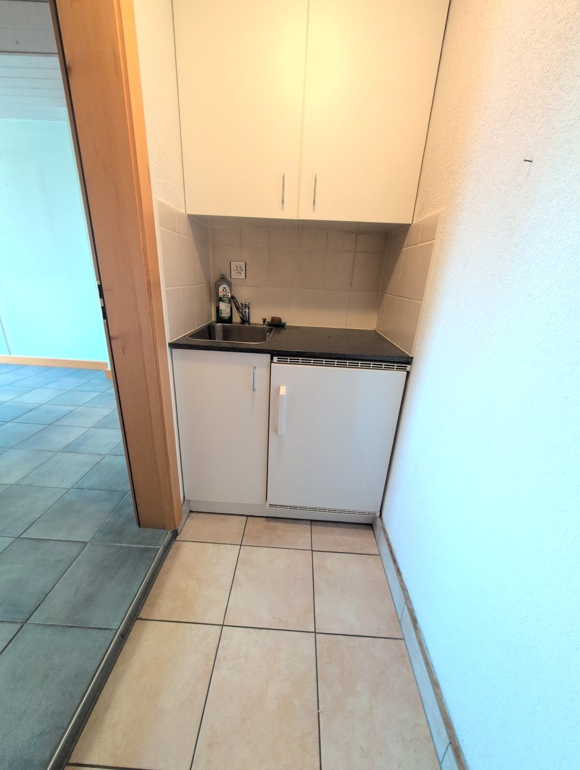 une cuisinette ouverte sur le couloir avec un évier et un petit frigo