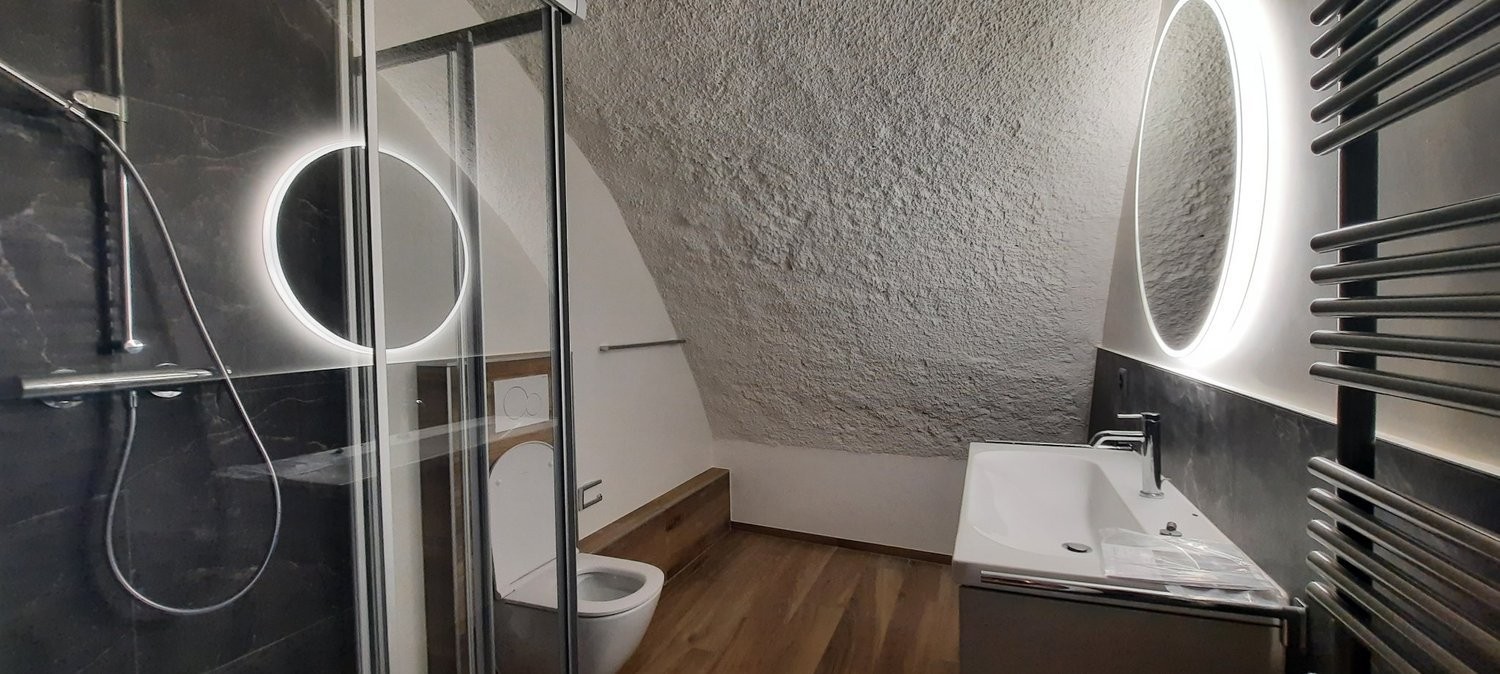 et d'une chambre à coucher de 60 m2. Une mezzanine avec douche/WC d'env. 40 m2 et un sous-sol de 100 m2