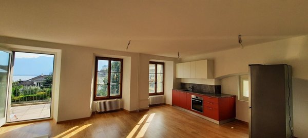 appartement atypique, entièrement rénové, a beaucoup de cachet. Au rez d'une maison de maître, il jouit d'une vue imprenable sur le lac et les montagnes (avec terrasse et jardin). Il dispose d'une cuisine agencée, d'une pièce à vivre
