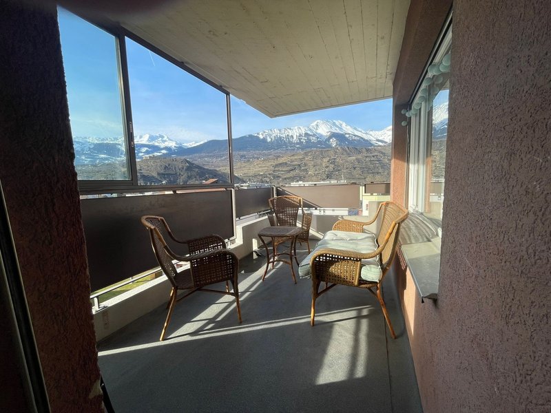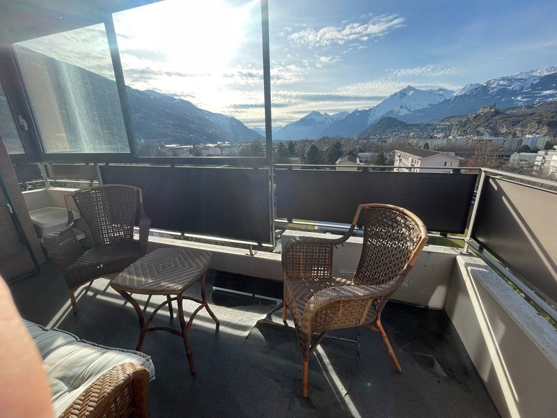 L'appartement se compose d'une grande cuisine, d'un spacieux salon, de deux chambres avec vue sur les montagnes — l'une d'environ 14 m² et une seconde d'environ 9,8 m² — ainsi que d'un balcon offrant une belle vue dégagée sur les Alpes valaisannes.