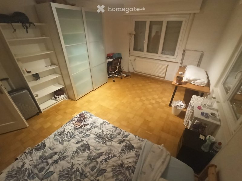 Chambre spacieuse et très lumineuse, offrant un espace confortable et agréable à vivre. Elle est équipée d?un bureau idéal pour le télétravail ou les études, d?un lit double et d?une grande armoire offrant de nombreux rangements. Une chambre idéale pour ceux qui recherchent confort et espace. (980 CHF/mois)