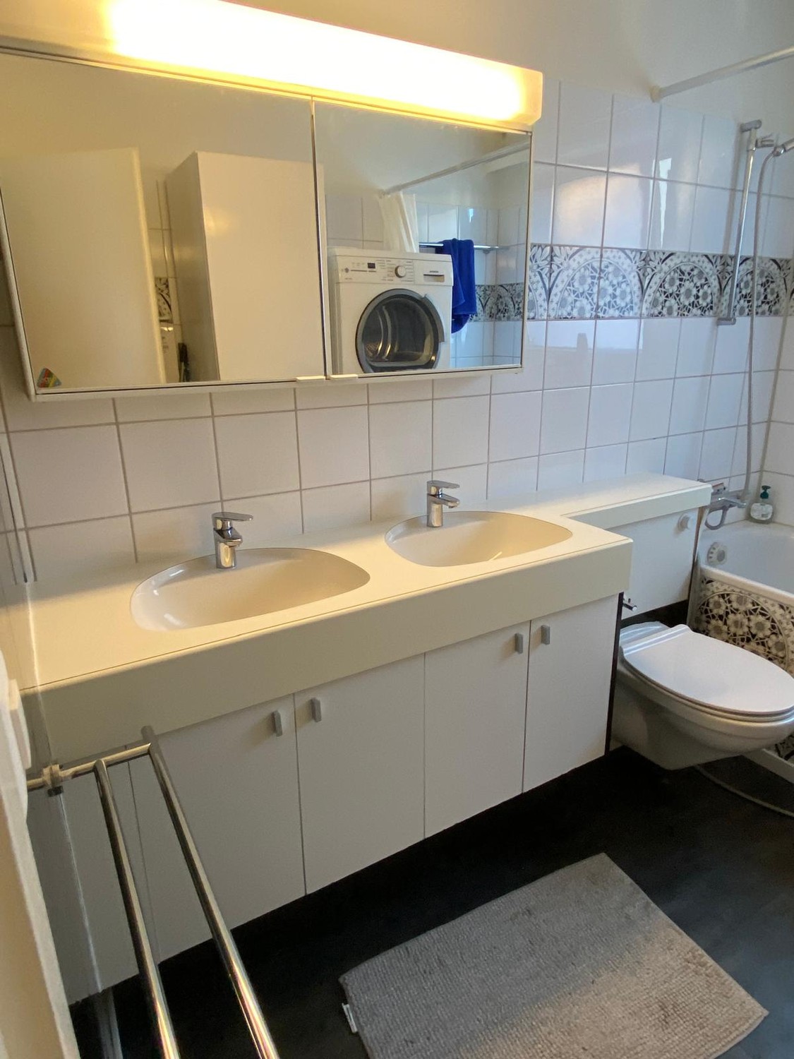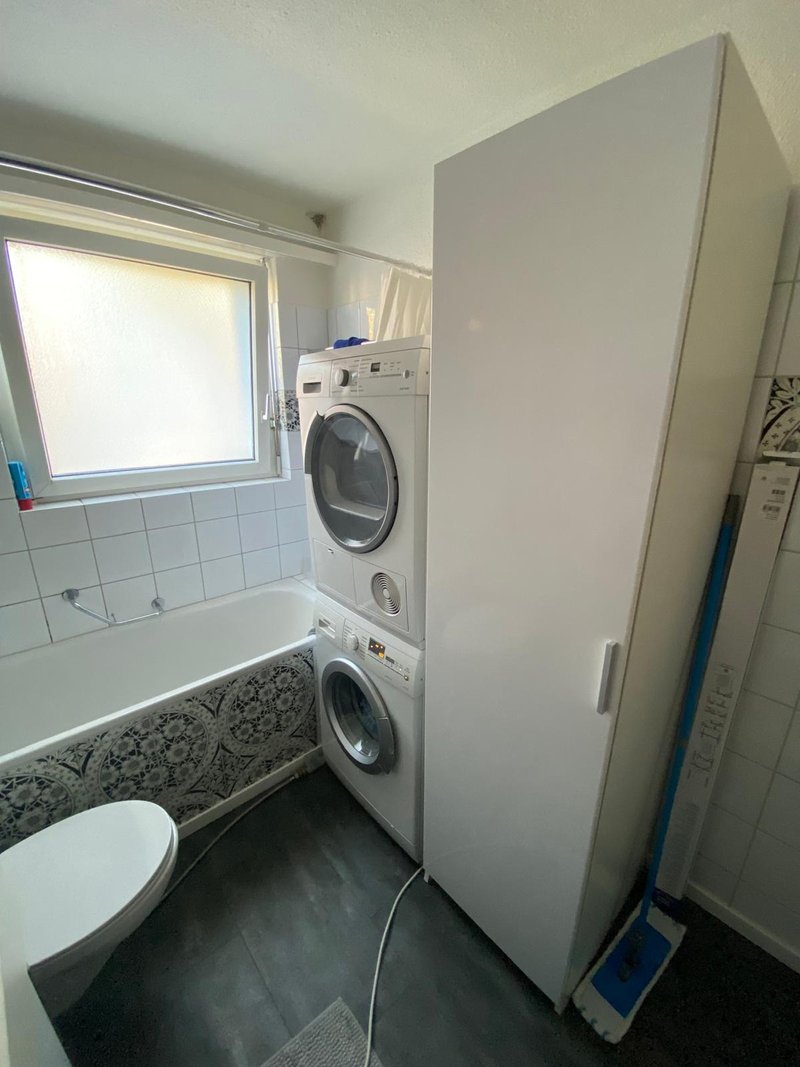 The main bathroom includes two sinks, a cabinet, a toilet, a bathtub, a washing machine, and a dryer. A noteworthy detail: it also features a large window.