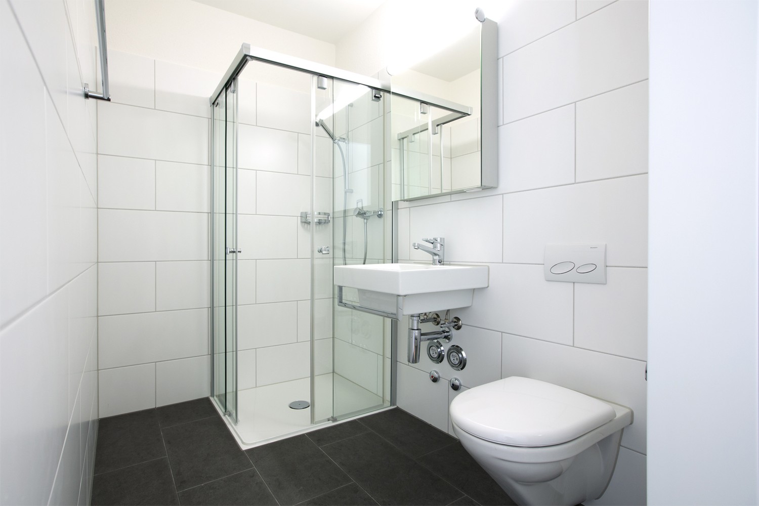 -zwei Nasszellen (Bad/WC und Dusche/WC) mit pflegeleichten Keramikplatten