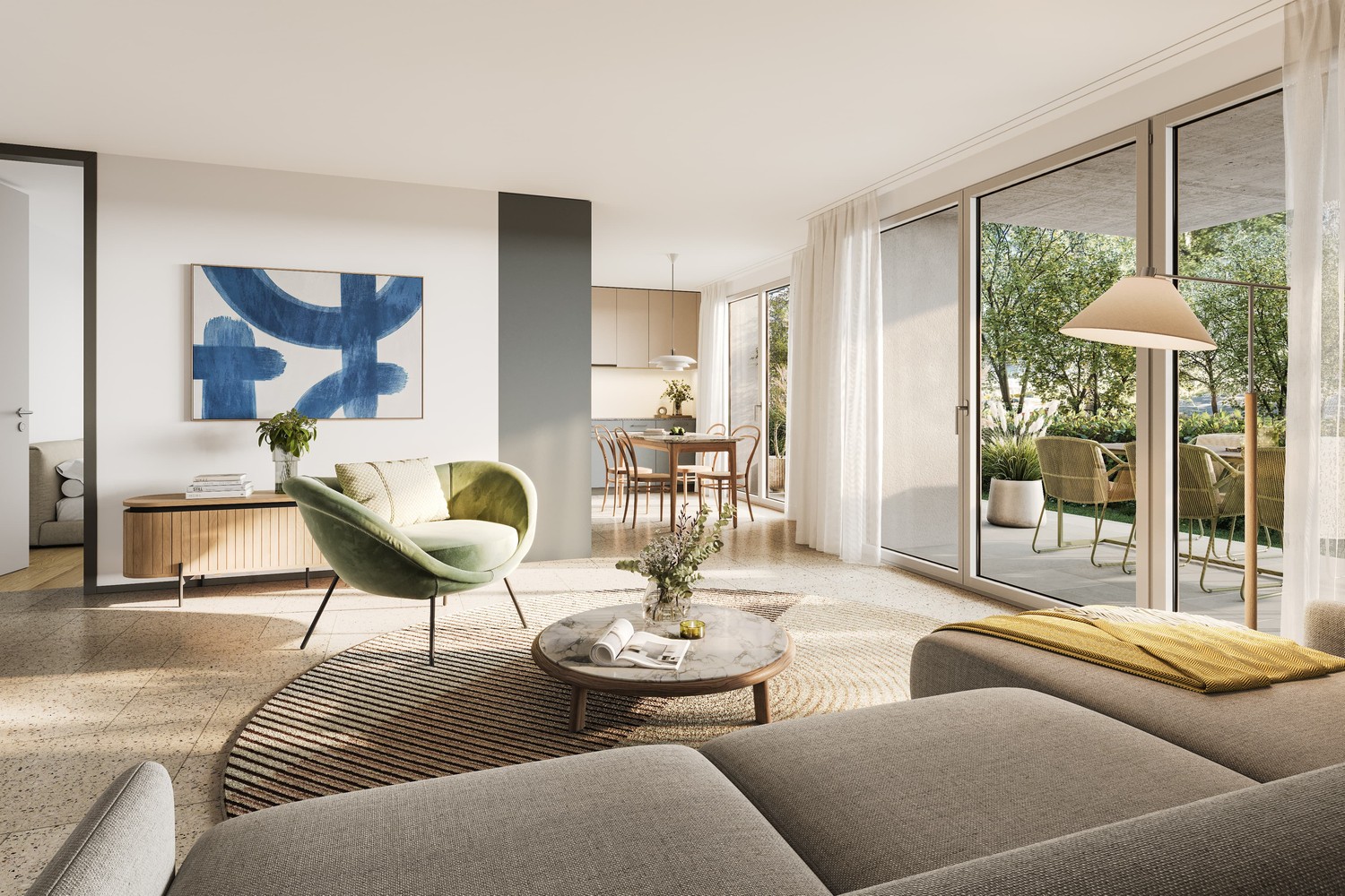 Helle, warme Materialien in mediterranen Farbtönen sorgen für ein frisches, zeitgemässes Wohnambiente, während feine Unterschiede in Bodenbelägen, Farben und Oberflächen jedem Raum seine individuelle Note verleihen. Grosszügige Balkone und Dachterrassen bieten private Rückzugsorte mit Blick ins Grüne.