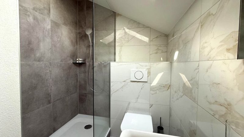 Bad (neu): Dusche mit Glasabtrennung, Wand-WC, breites Waschtischbecken, Handtuchheizkörper, grossformatige Fliesen in Stein-/Marmoroptik, Dachfenster für Licht & Lüftung.