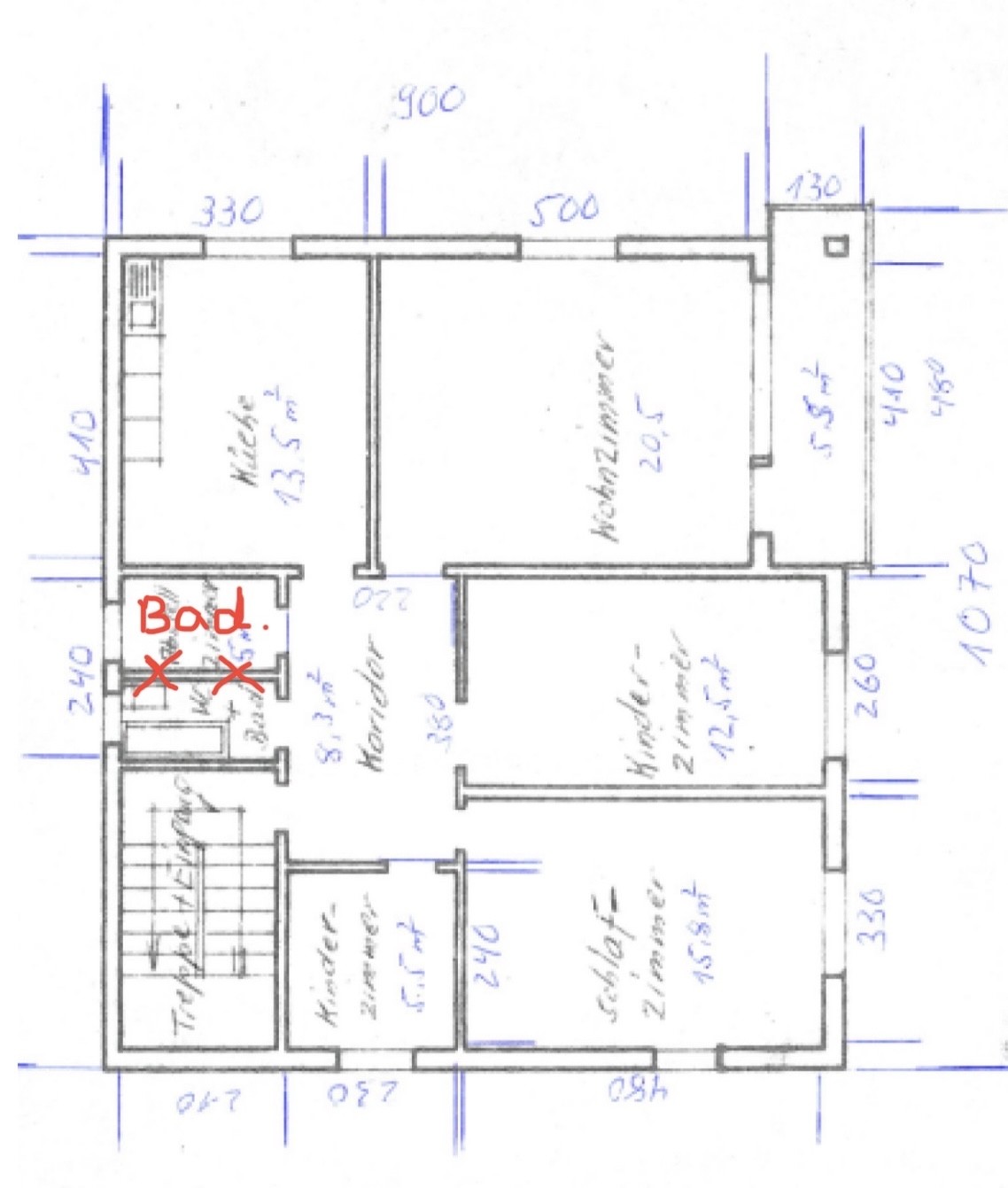 2 grosse Schlafzimmer plus 1 kleineres Schlafzimmer/Büro, Wohnzimmer, separate Küche und Badezimmer mit Badewanne und separater Dusch