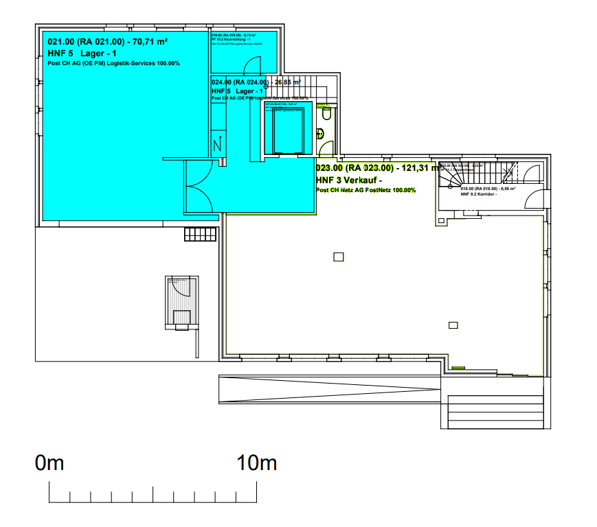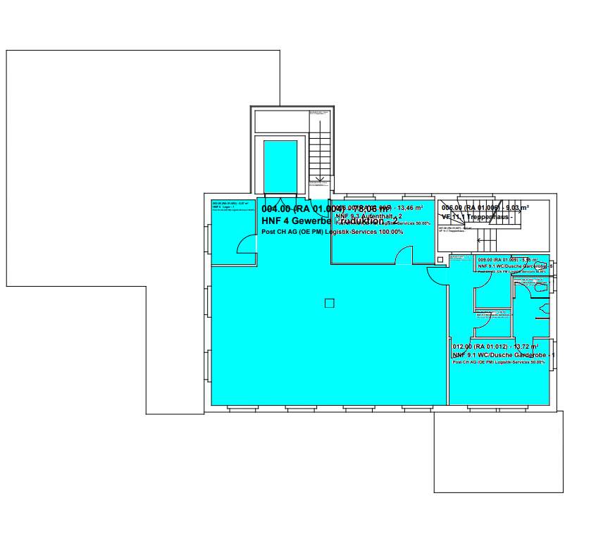 Die Mietfläche von total 240 m2 befindet sich im Erdgeschoss mit 110 m2 (Anlieferung / Gewerbe) sowie im 1. Obergeschoss mit 130 m2 (Lager, Büro, Gewerbe, Korridor, WC/Dusche/Garderobe)