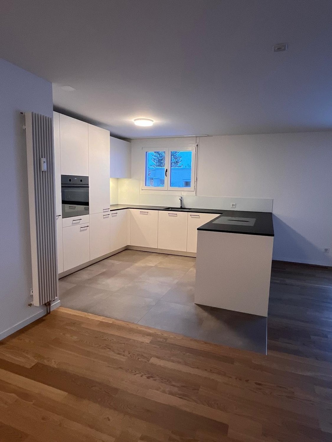 - Küche mit viel Stauraum, weissen Fronten, Plattenboden, Induktionsherd
