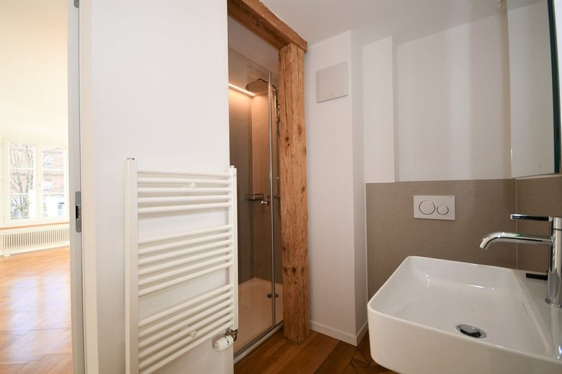 Geschmackvolle sanierte Wohnung, sorgfältig aufbereiteter Parkett vereint mit neuer Architektur, grosszügige Küche, moderner Sanitärraum, eigener Waschturm. Wohnraum zum Wohlfühlen.