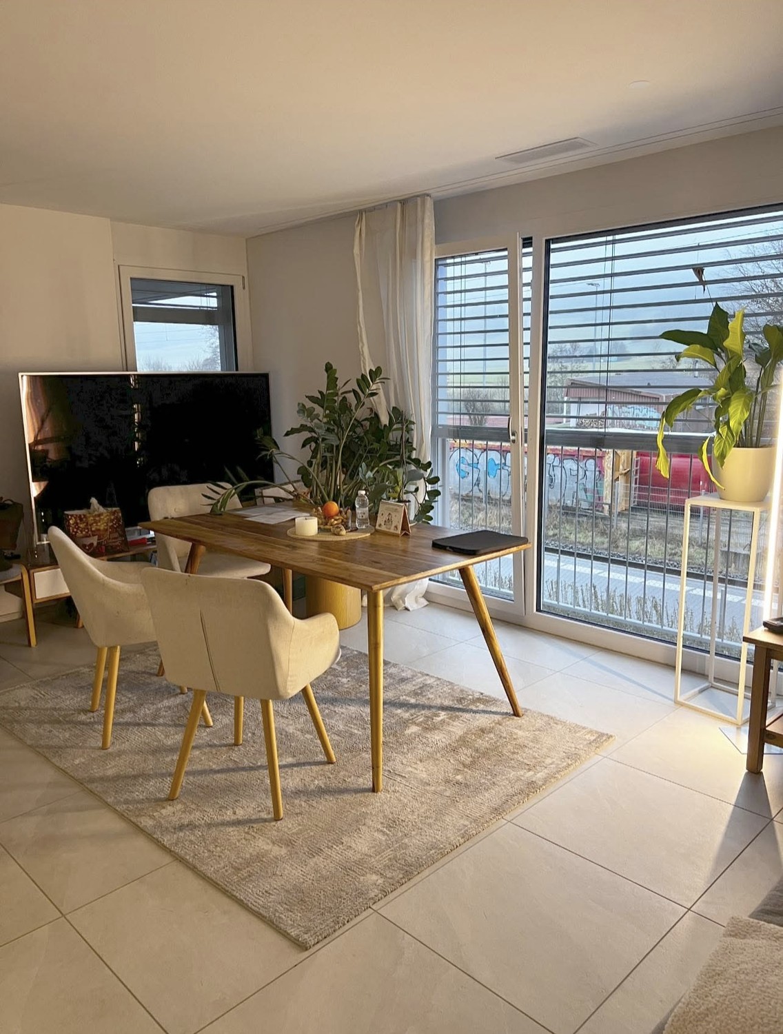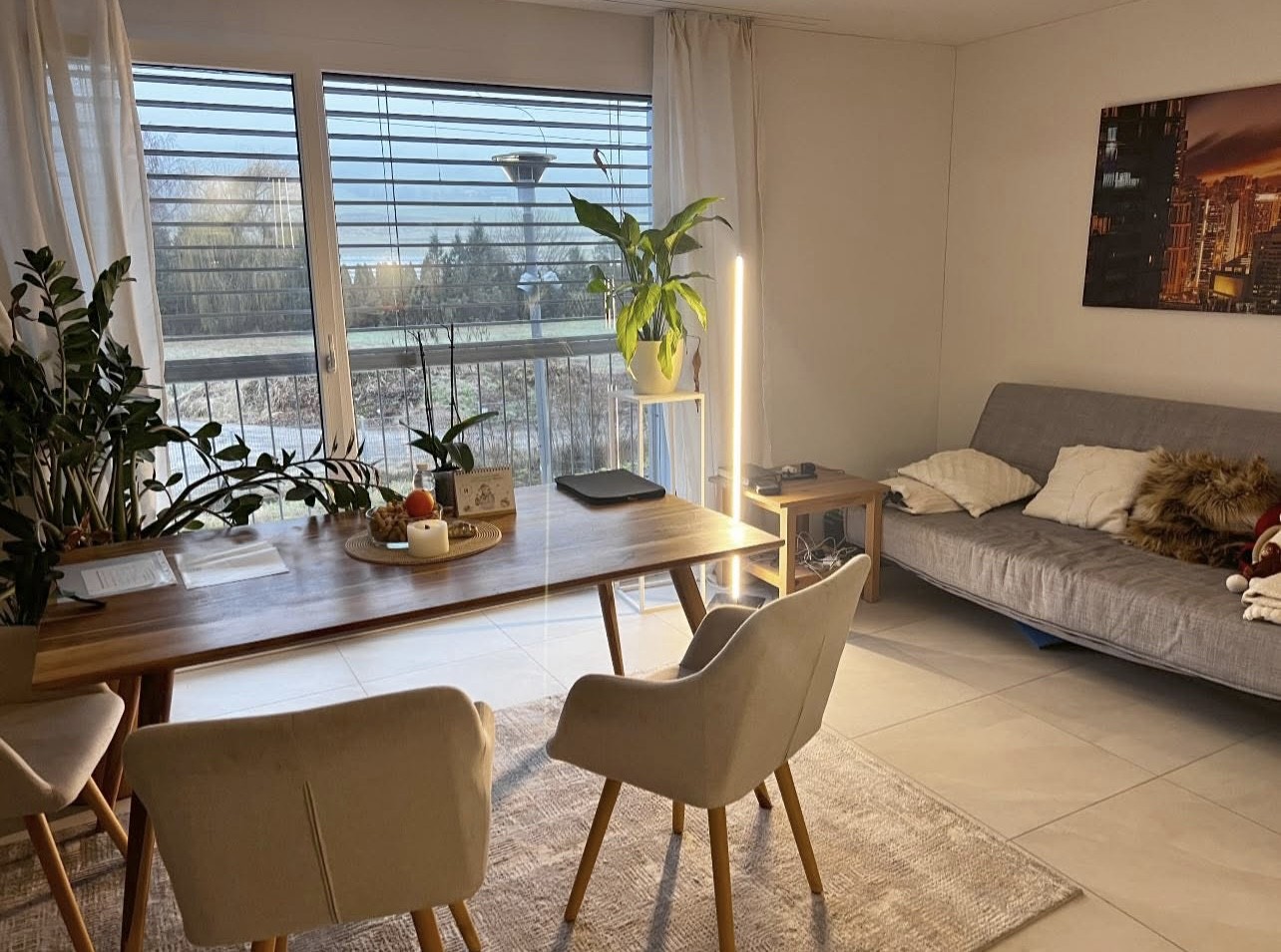 Offener Wohn- und Essbereich: Heller Raum mit Fliessen, bietet genug Platz für ein Essbereich mit grossen Tisch sowie direktem Zugang zum Balkon