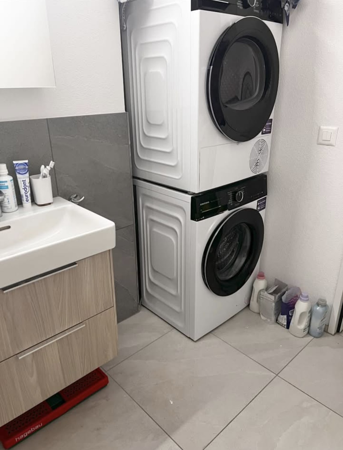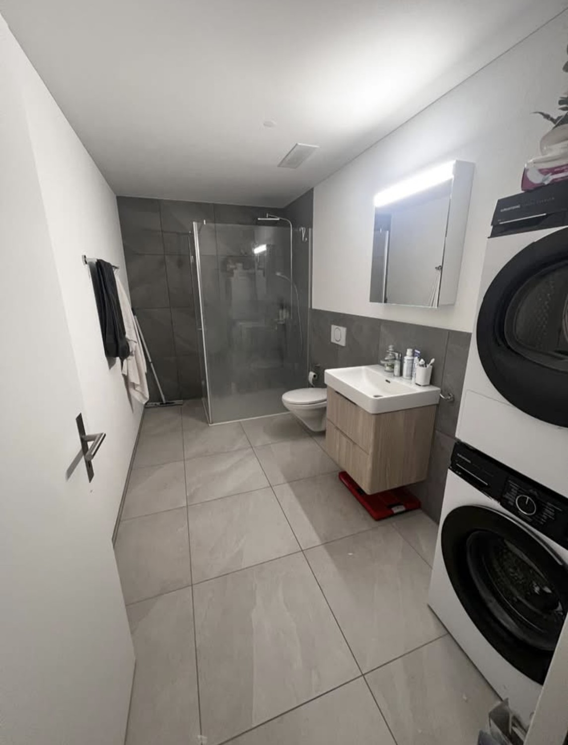 Modernes Badezimmer: Mit grosser Dusche und eigener Waschmaschine sowie Tumbler