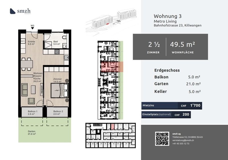 Urban wohnen. Direkt am Bahnhof Killwangen. Metro Living ist Wohnen an einem Ort, der Mobilität, Komfort und Zukunft vereint. Diese helle 2.5-Zimmer-Gartenwohnung im Erdgeschoss verbindet effiziente Raumplanung mit privatem Aussenraum - ideal für Pendler:innen und alle, die das Limmattal lieben.