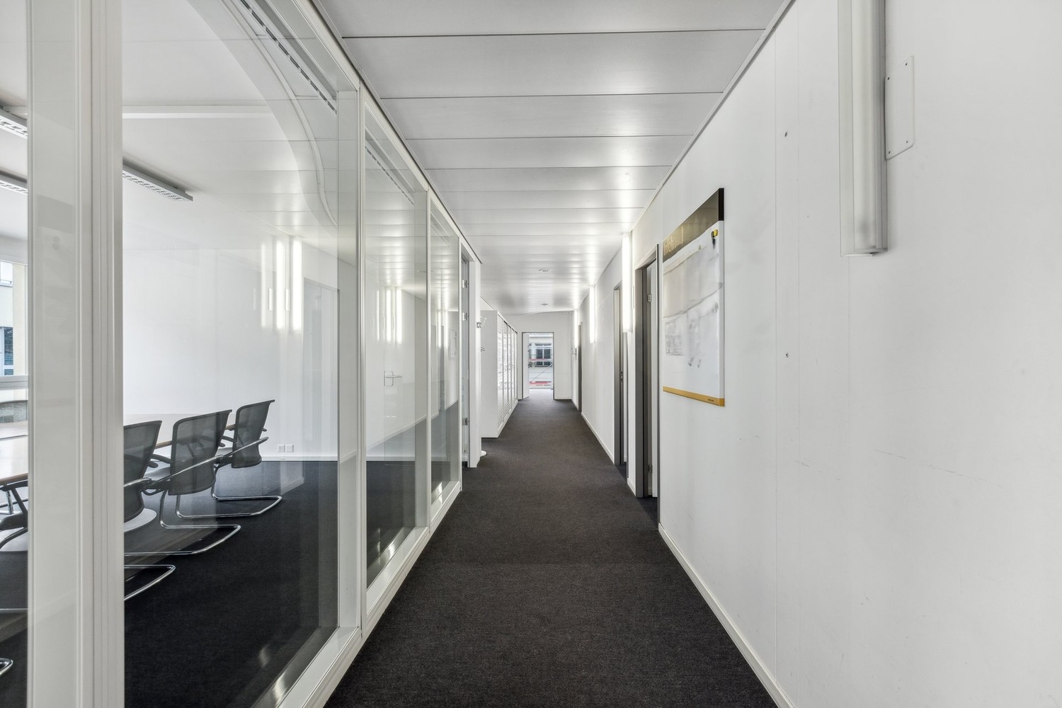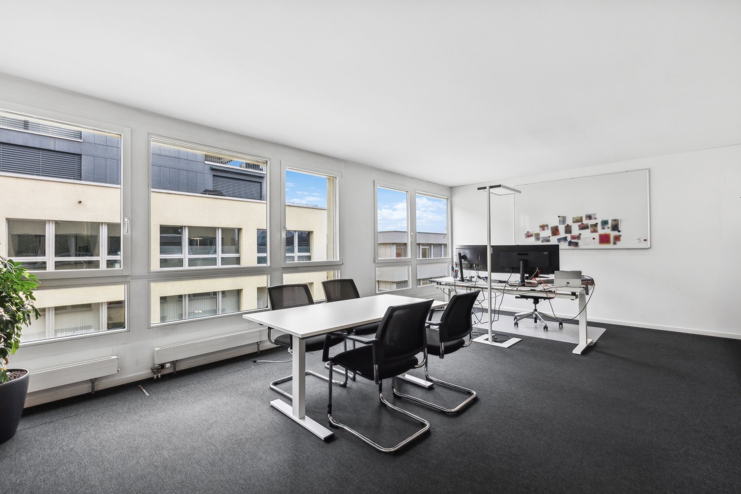 Die rund 1'415 m² grosse Fläche befindet sich im ganzen 1. Obergeschoss. Diverse Eingänge über 3 Treppenhäuser und viele Fenster lassen eine flexible Unterteilung der Flächen zu. Drei Balkone auf der Südfassade mit je rund 30m² bieten attraktiven privaten Aussenraum für MitarbeiterInnen und Kundschaft.