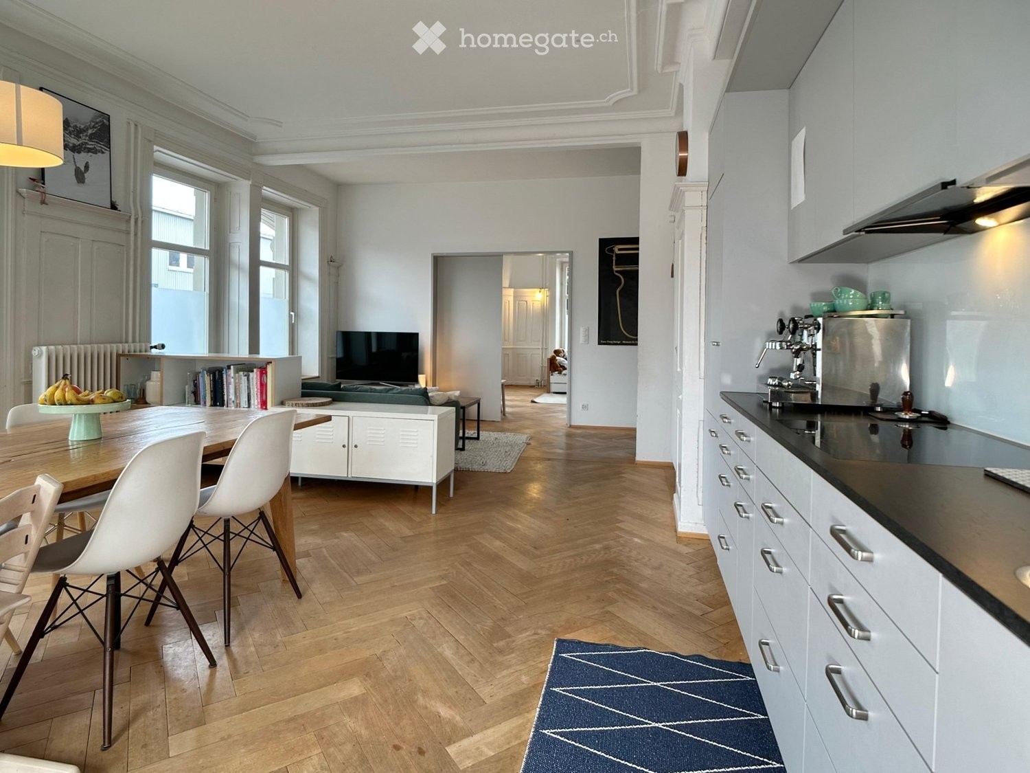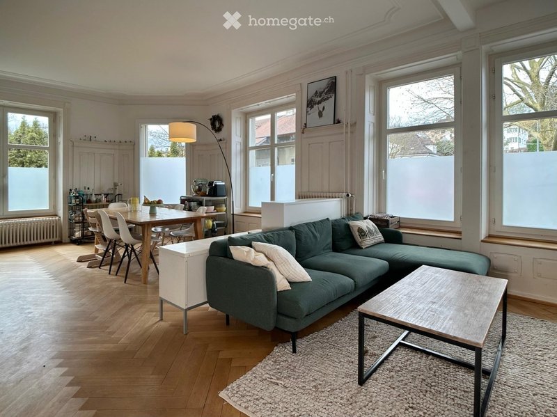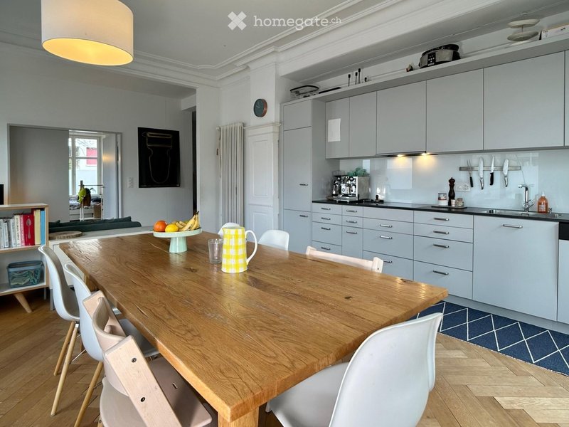 Diese stilvolle 120 m² Wohnung verbindet klassischen Altbau-Charme mit modernem Wohnkomfort. Hohe Decken teilweise mit Stuckatur sowie ein aussergewöhnlich grosszügiger Wohn- und Essbereich schaffen eine helle, offene Atmosphäre mit viel Raumgefühl.