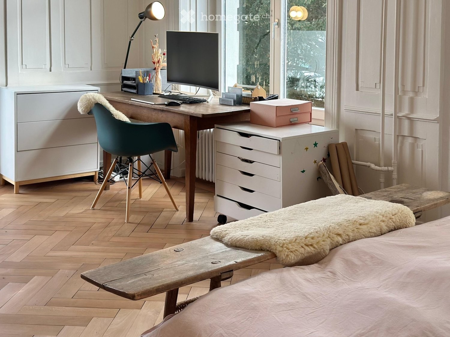Elternschlafzimmer mit integriertem Arbeitsplatz (Schreibtisch)