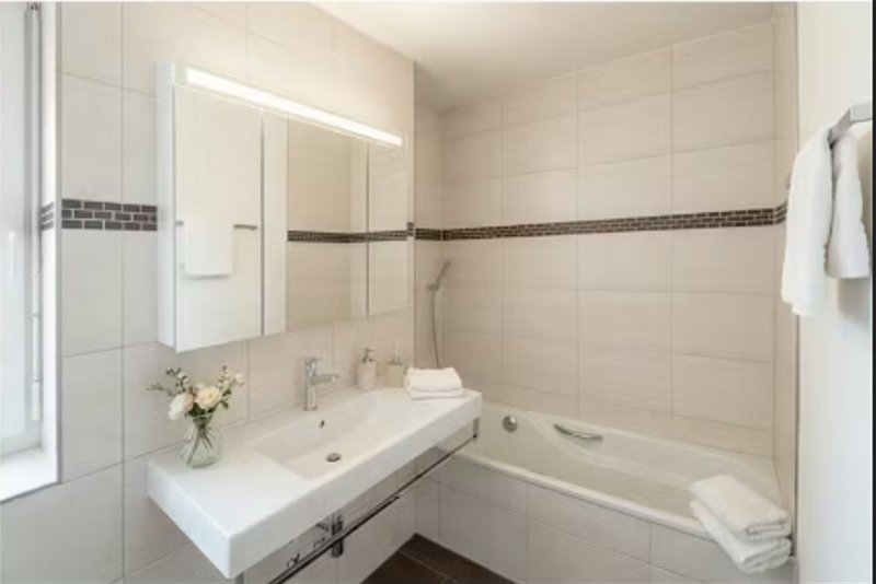 Badezimmer mit WC, Lavabo, Spiegelschrank, Badewanne und Tageslicht
