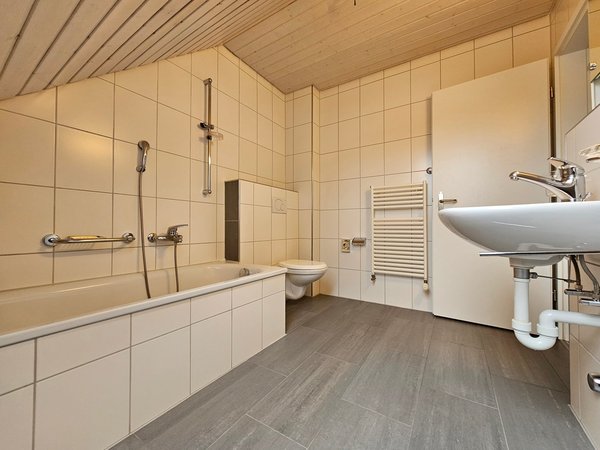Bad/WC mit Badewanne in hellen Farben.