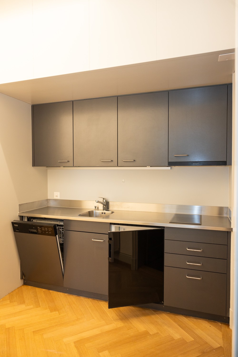 - Küche mit Abwaschmaschine, kleiner Herd, Kühlschrank