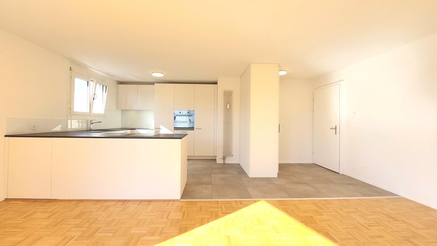 - Küche mit ausreichend Stauraum, weissen Fronten, pflegeleichtem Plattenboden und Induktionsherd