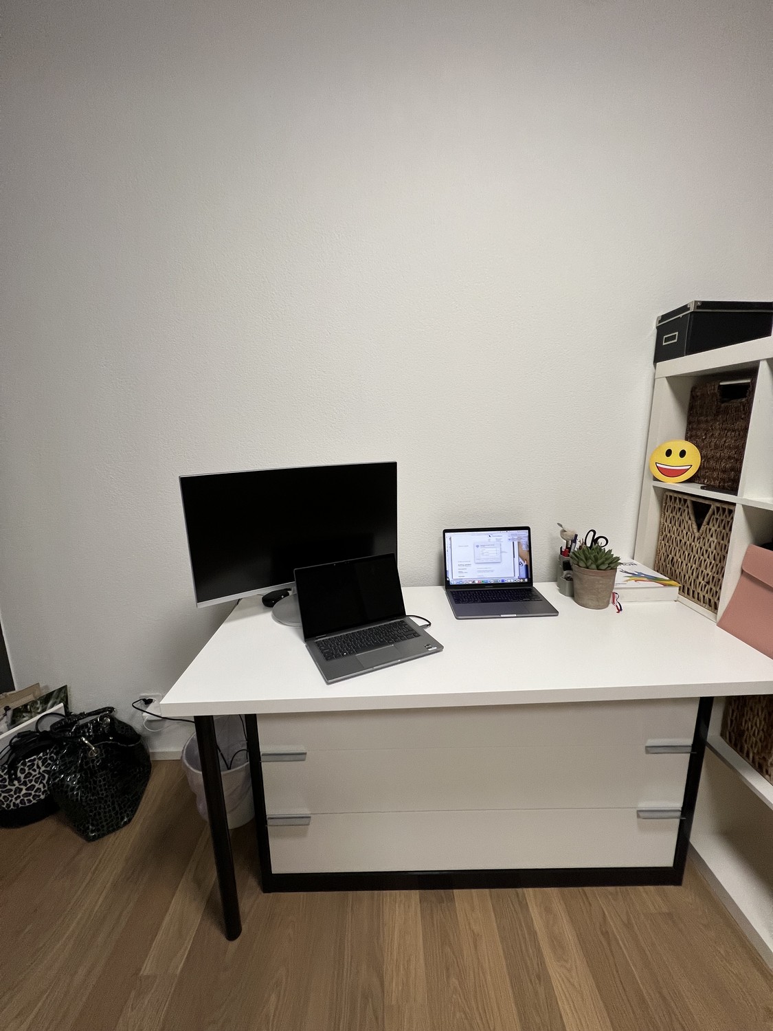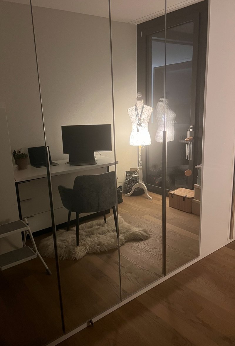 Ausgestattet mit grossem Schreibtisch und zusätzlichen Schränken bietet es beste Voraussetzungen für produktives Arbeiten von zuhause aus – mit direktem Zugang zum Balkon.