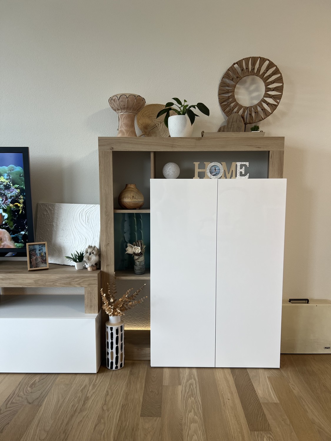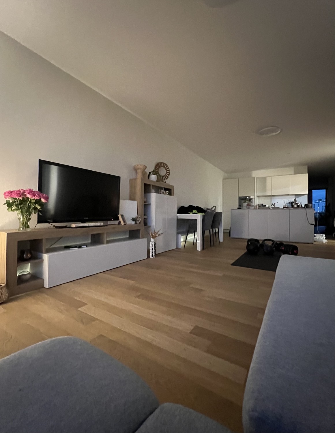 Eine stilvolle Anrichte trennt den Wohnbereich elegant vom grosszügigen Ess- und Küchenbereich. Die schlichten, weissen Küchenfronten unterstreichen das luftige Loft-Gefühl und verleihen dem Raum zusätzliche Weite.