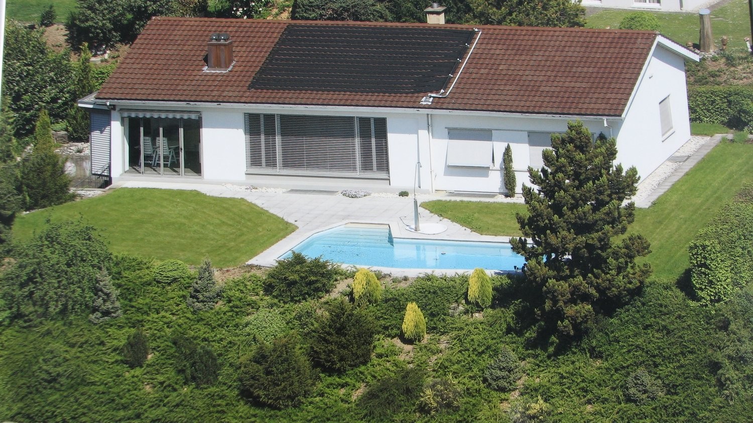 Der traumhafte Garten überzeugt u.a. durch den beheizbaren Pool (9 Meter, Solarheizung) und die Terrasse mit Blick in die Alpen.