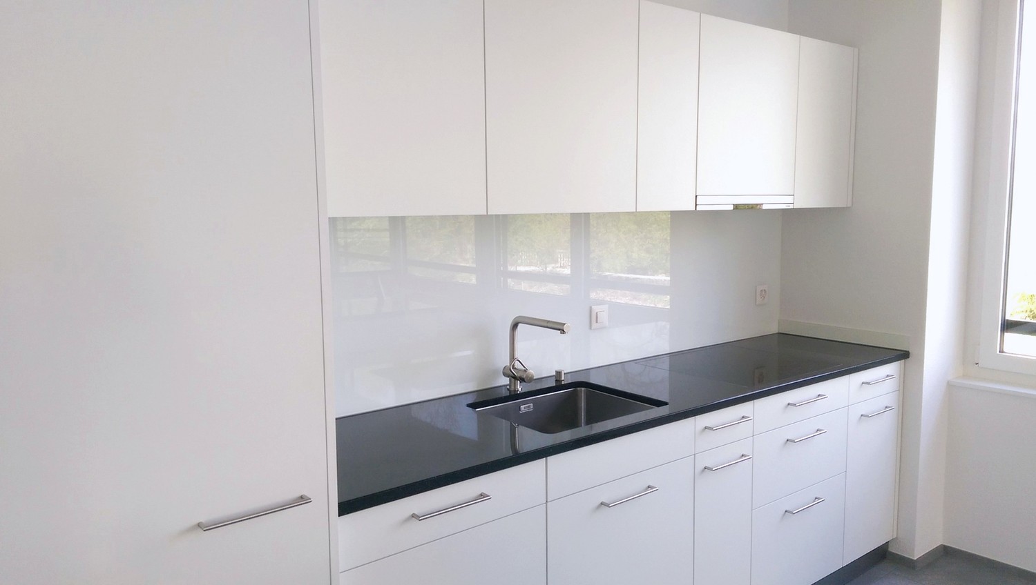 offener Küche: Modern ausgestattet mit schwarzen Granit-Arbeitsplatten, Premium Edelstahlgeräten, integriertem Steamer, weissen Schränken und grosser Kochinsel.